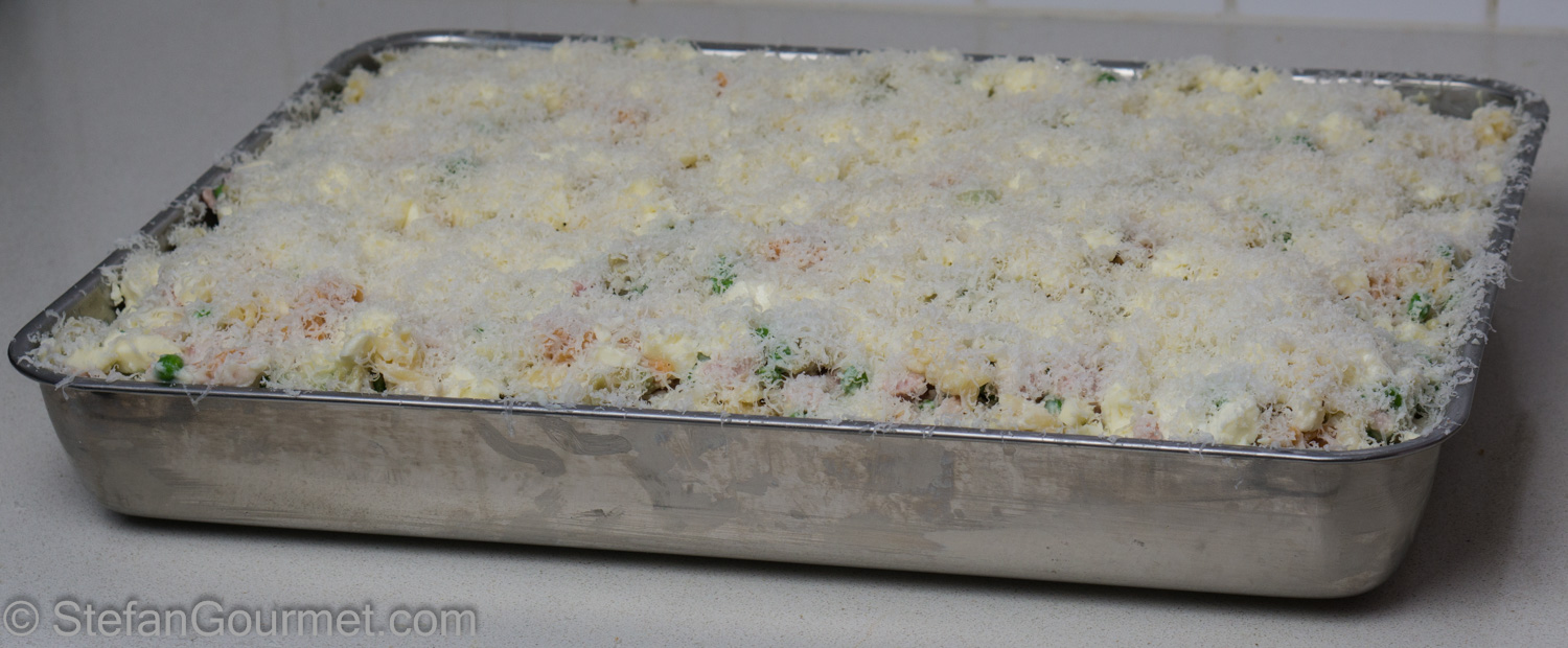 This baked pasta with ham and peas is as tasty as it is easy to prepare. You can use any type of short pasta for this dish. For additional color, I used fusilli tricolori. I was feeding a crowd, so you may want to make only half of the recipe. Here’s what I did…