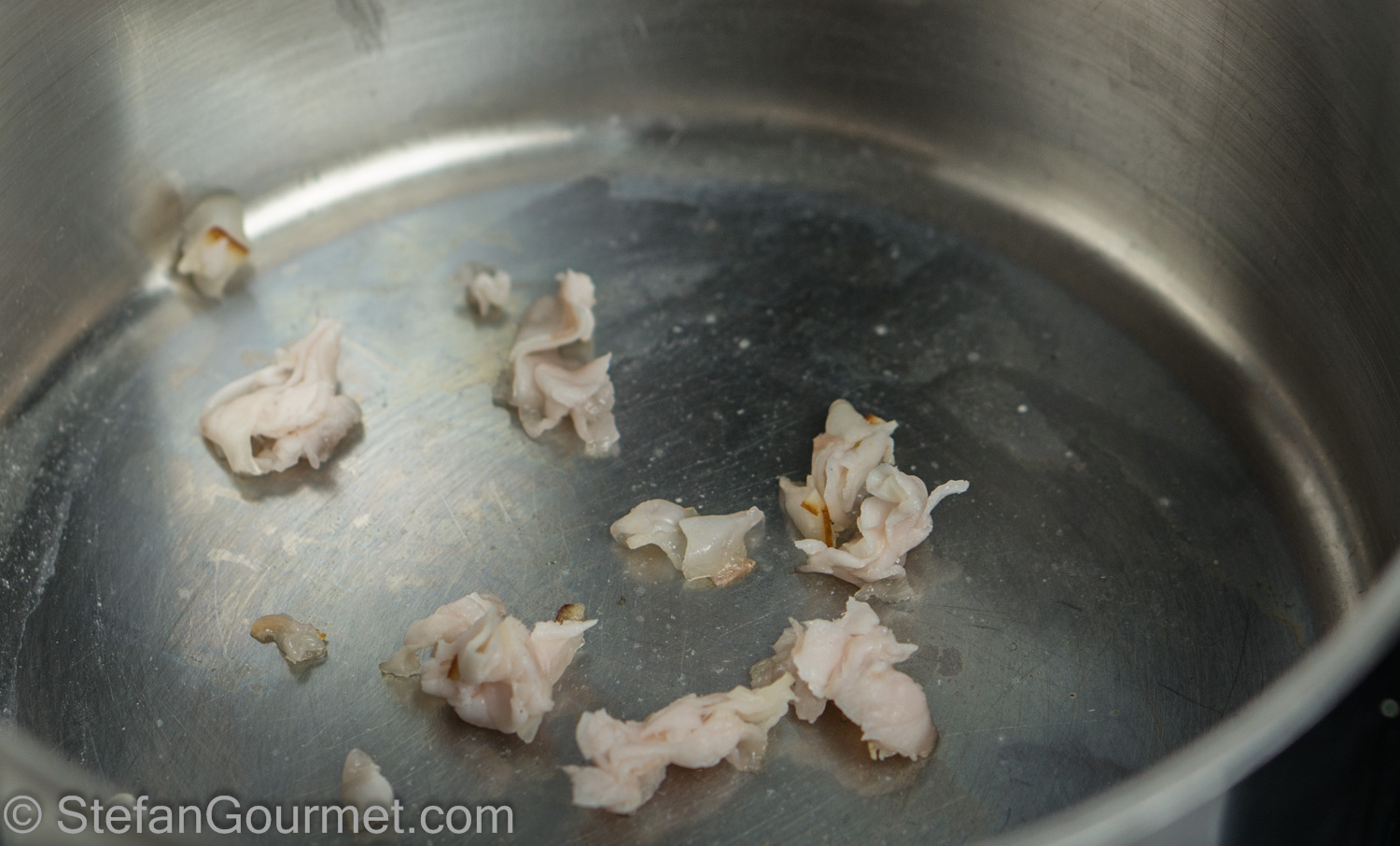 In a saucepan, render the fat from the strips of fat over medium heat.