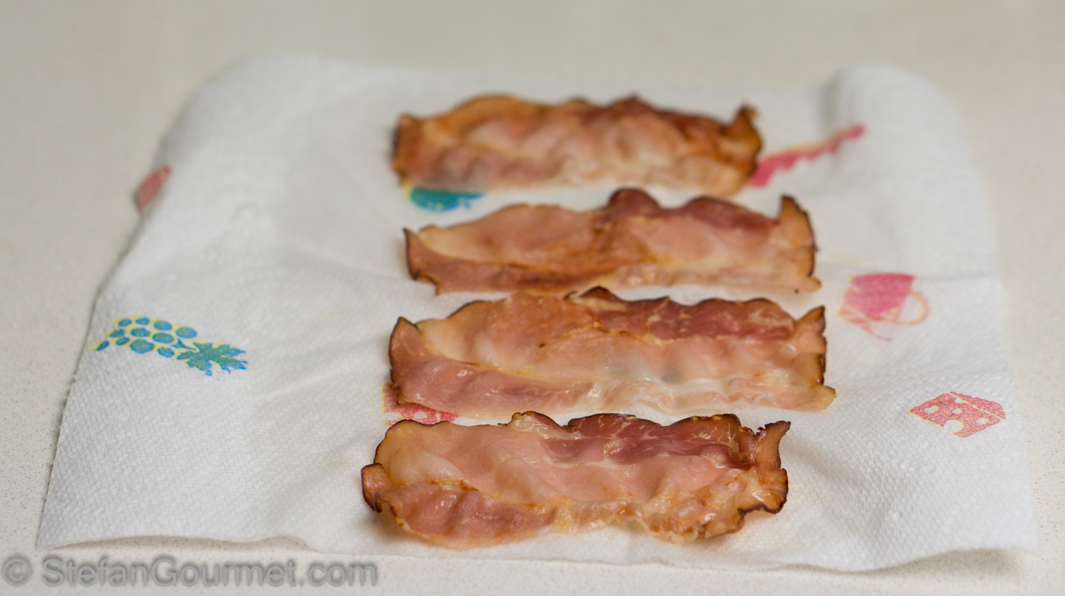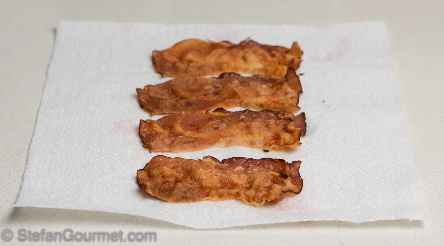 If not all the fat has rendered yet, replace the bottom sheet of paper, and nuke for another 30 seconds to 1 minute…