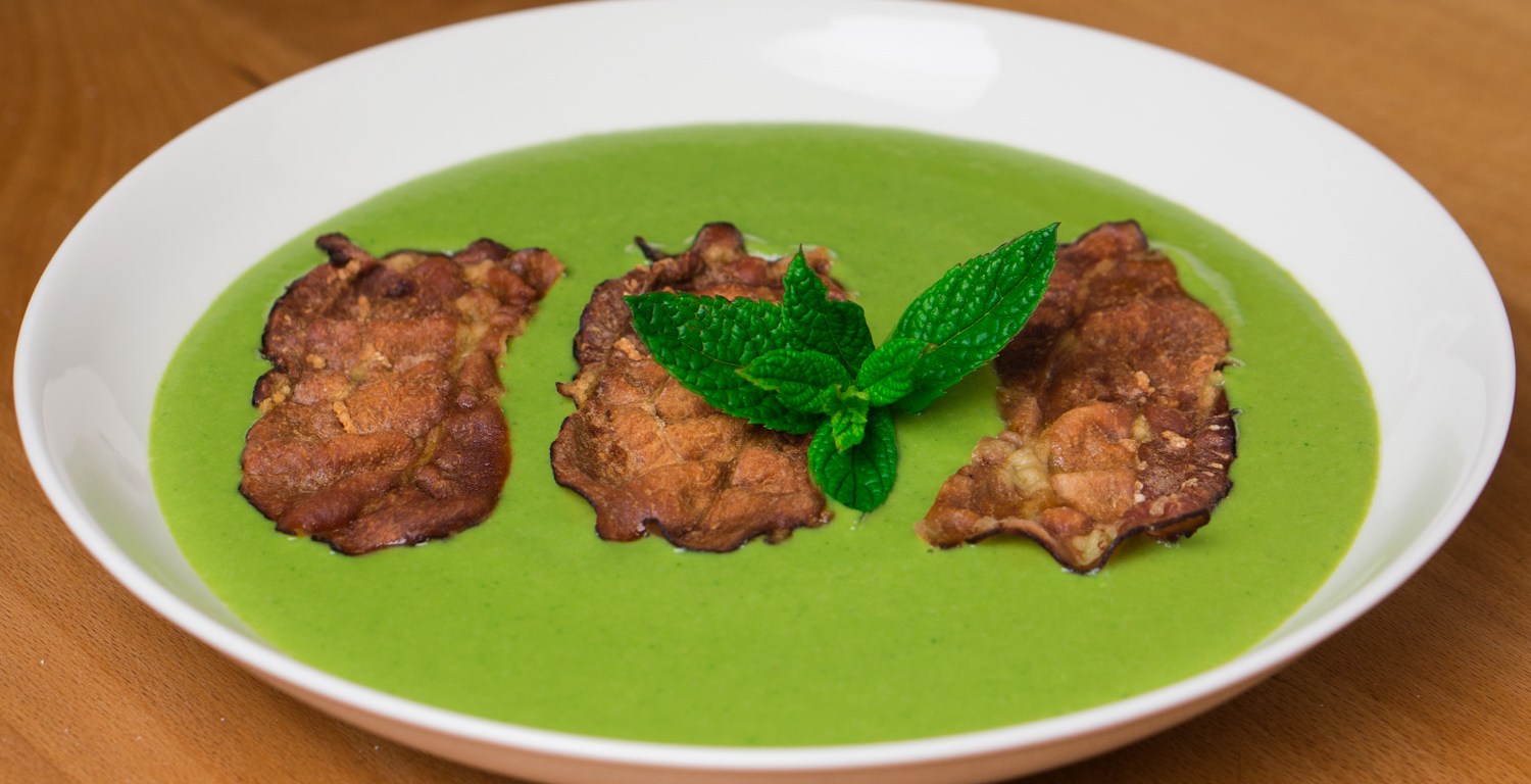 Garnish the velouté with the crispy speck and additional mint, and serve at once. I kept the slices of speck whole as it would be prettier for the photo, but it is easier to eat when you break it up into small pieces.