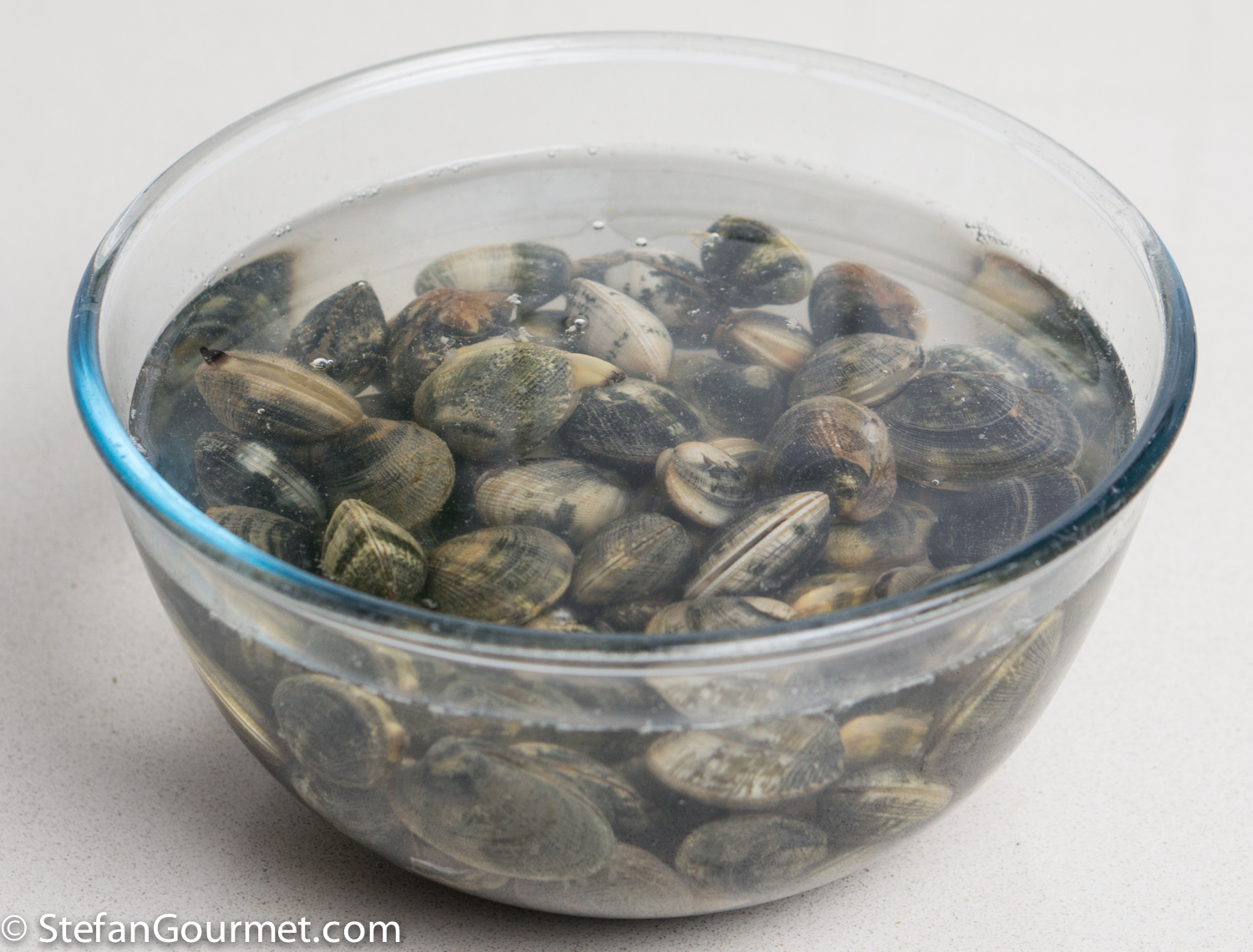 Dissolve 30 grams (4 tsp) salt into 1 litre (4 cups) of water to create water that is as salty as the sea. Allow the clams to soak in this water for at least an hour. The poor devils will think they are back in the sea and will purge themselves of any sand and other impurities.