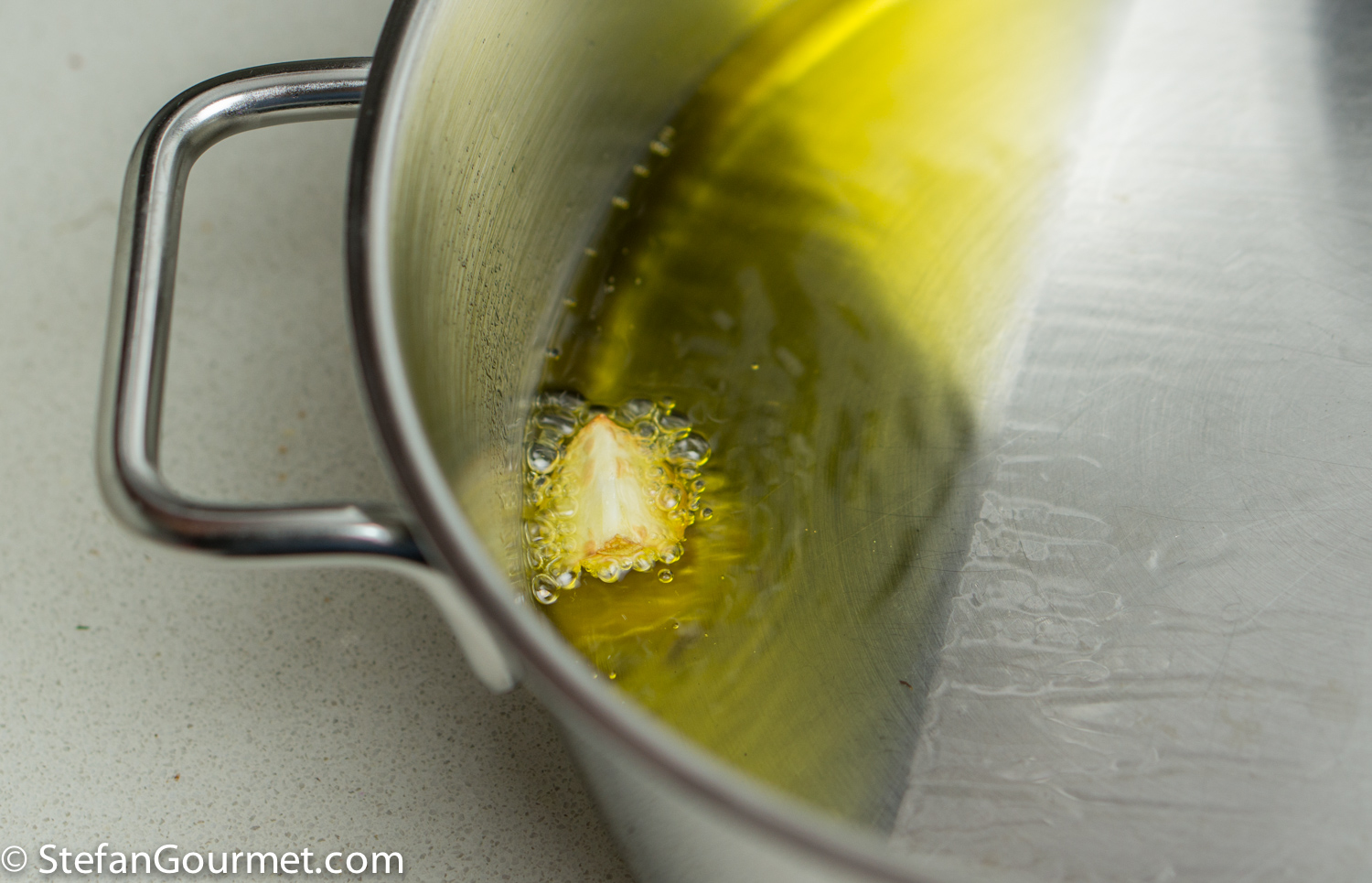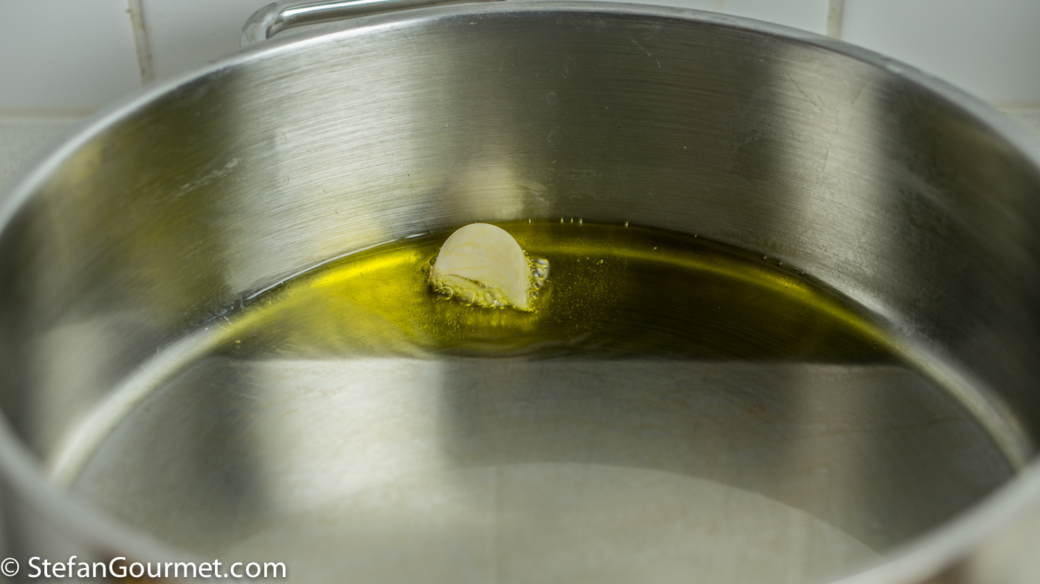 Heat two tablespoons olive oil in a frying pan. Add the clove of garlic and tilt the pan until the garlic clove is golden, then discard the garlic.