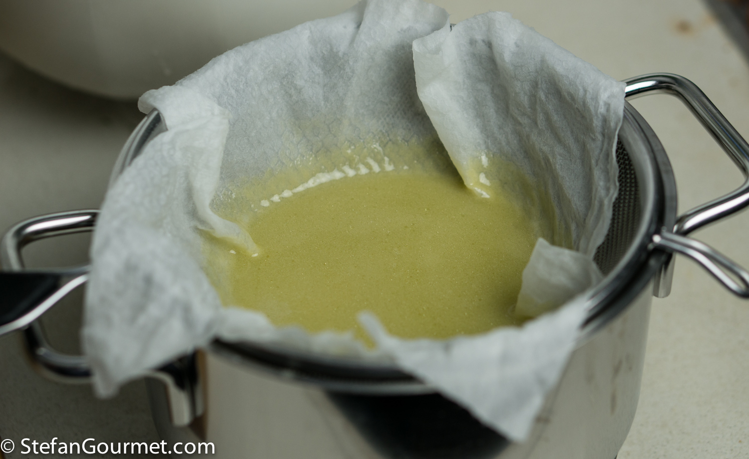 Strain the juices released from the clams, and filter with kitchen paper or a cheese cloth into a saucepan. Keep the clam juices hot.