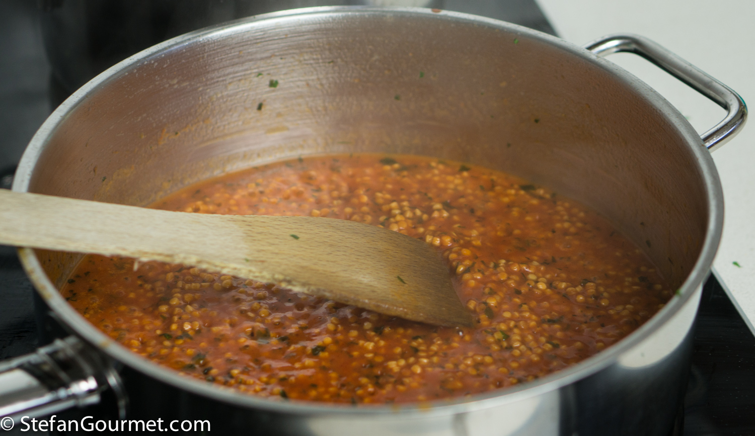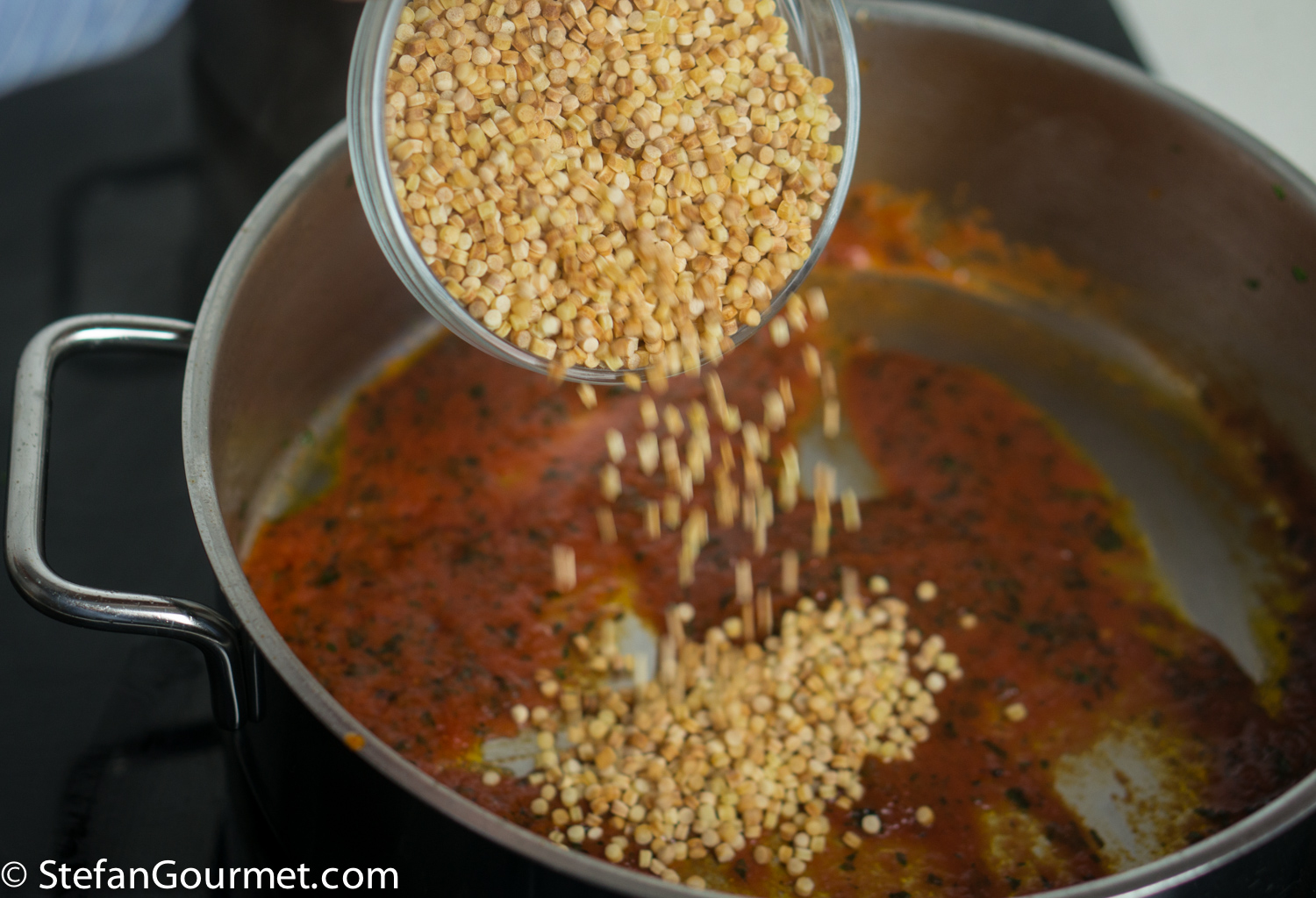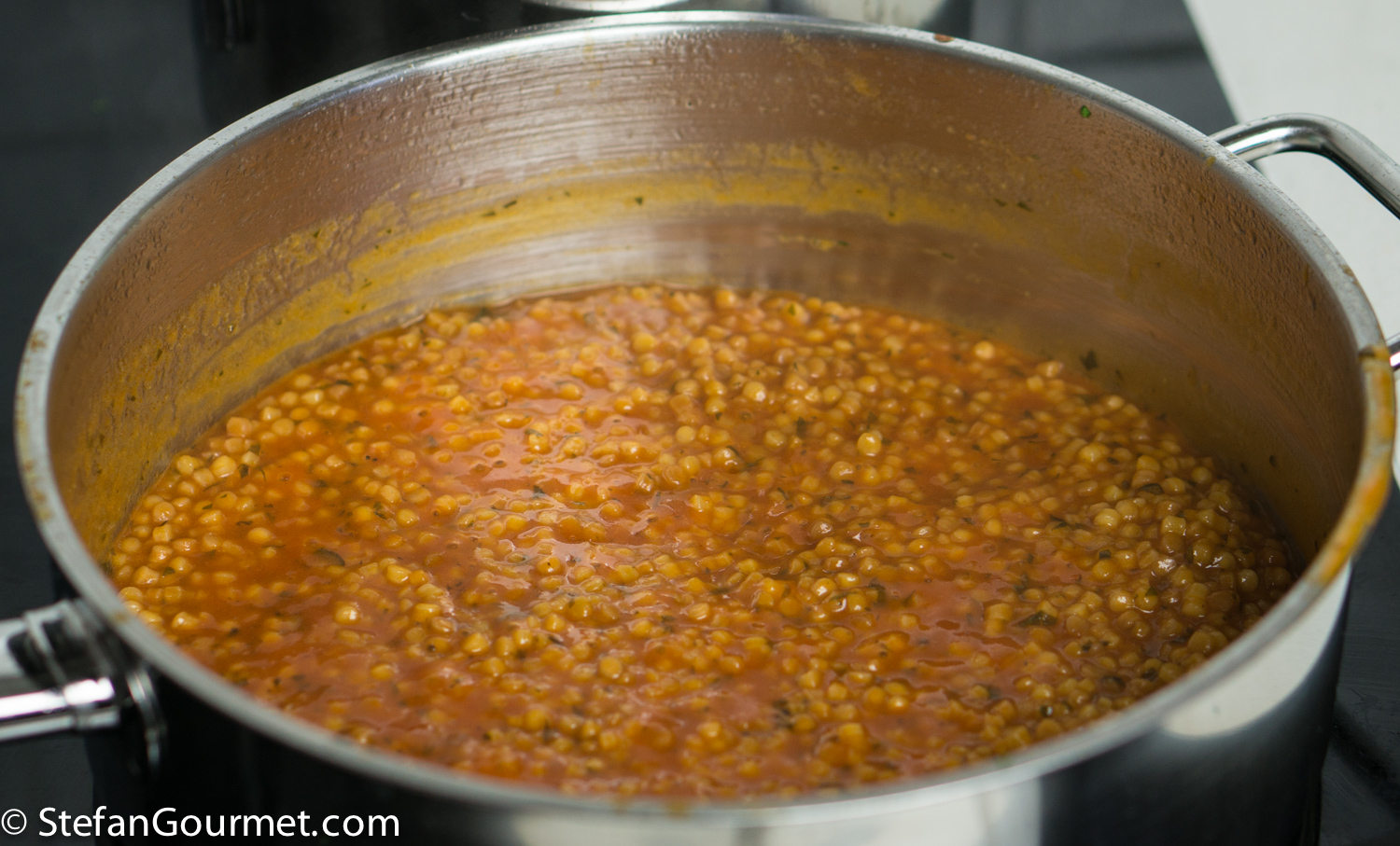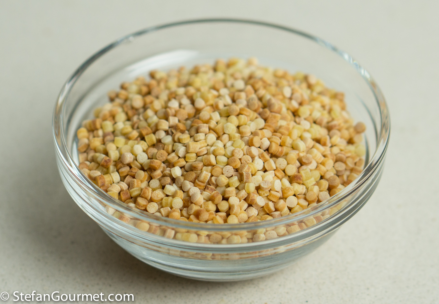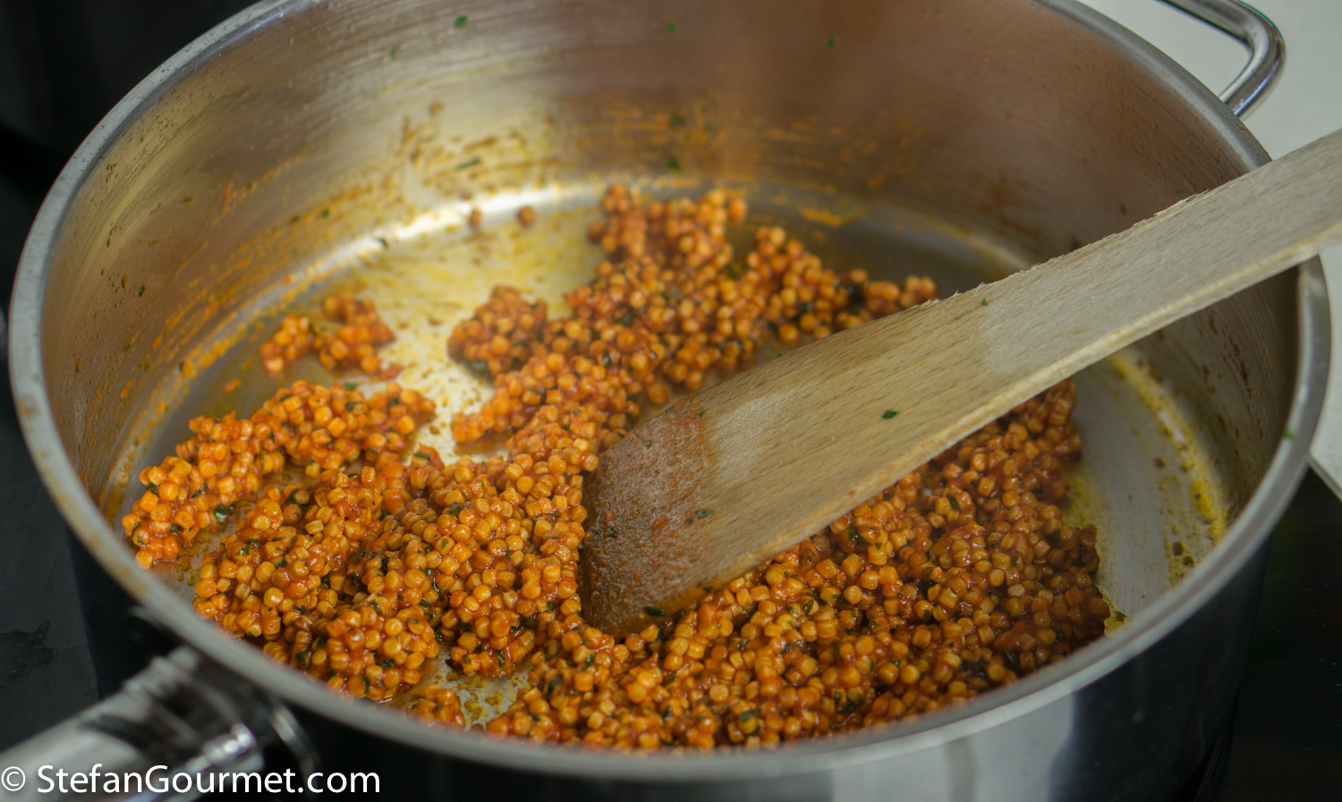 Each region of Italy has its own pasta shapes. One of the typical shapes of Sardinia (Sardegna) is fregula or fregola, made from durum wheat flour and water, and similar to cous cous. The store-bought variety is a bit like thick spaghetti, cut into very short pieces. It can be made by hand, but the advantage of the store-bought version is that it is doesn’t only save you the time to make your own, but it is also easier to cook without risk of overcooking. The store-bought fregula that I found were toasted, which adds another layer of flavor.