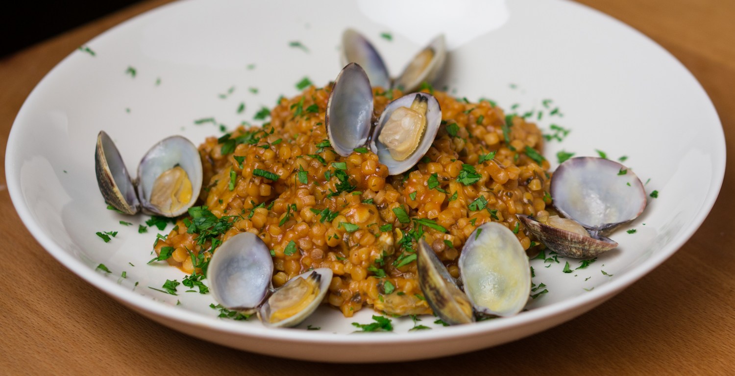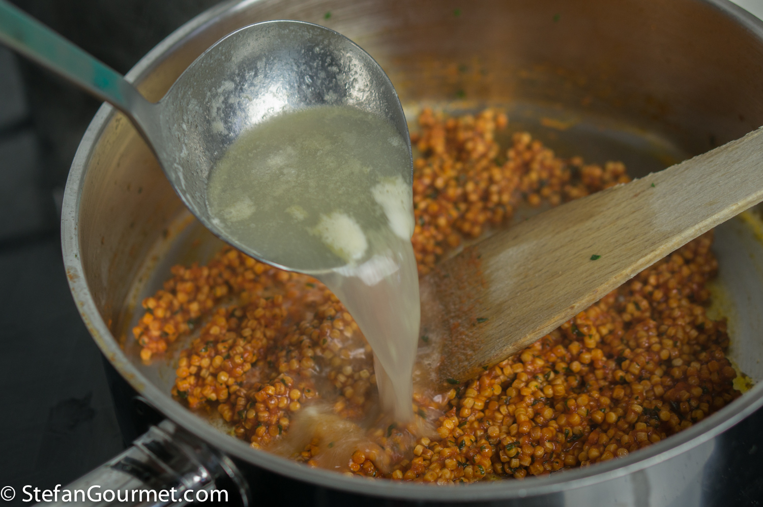 Now cook the fregula as if it were risotto, using the hot clam juices for stock. So add a ladle of the clam juices…