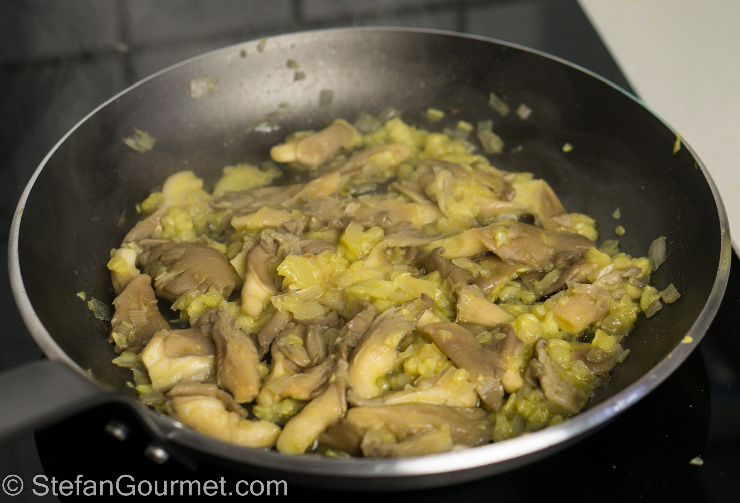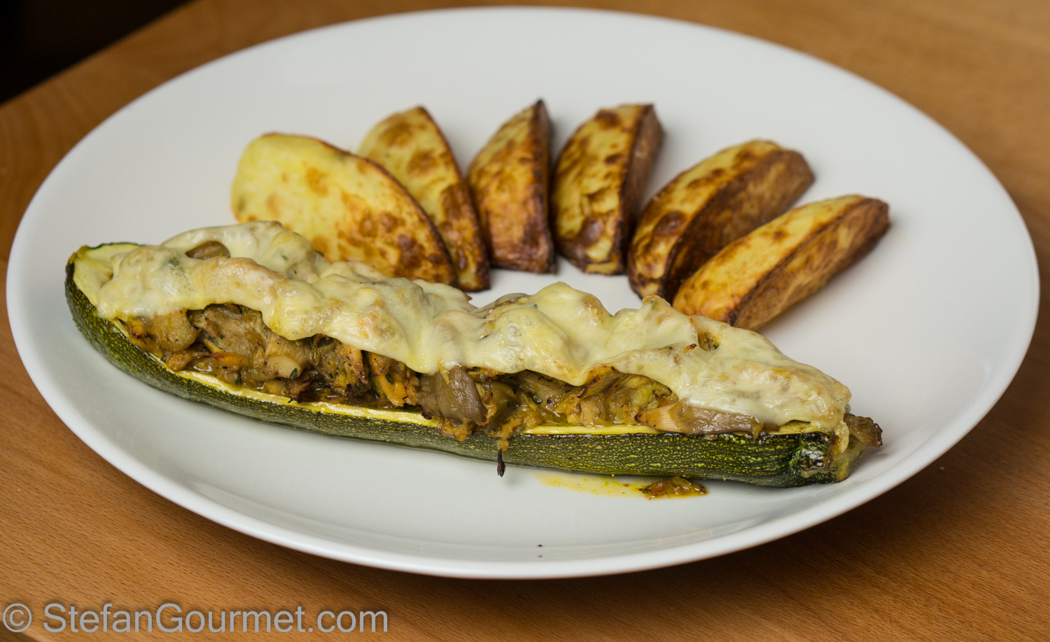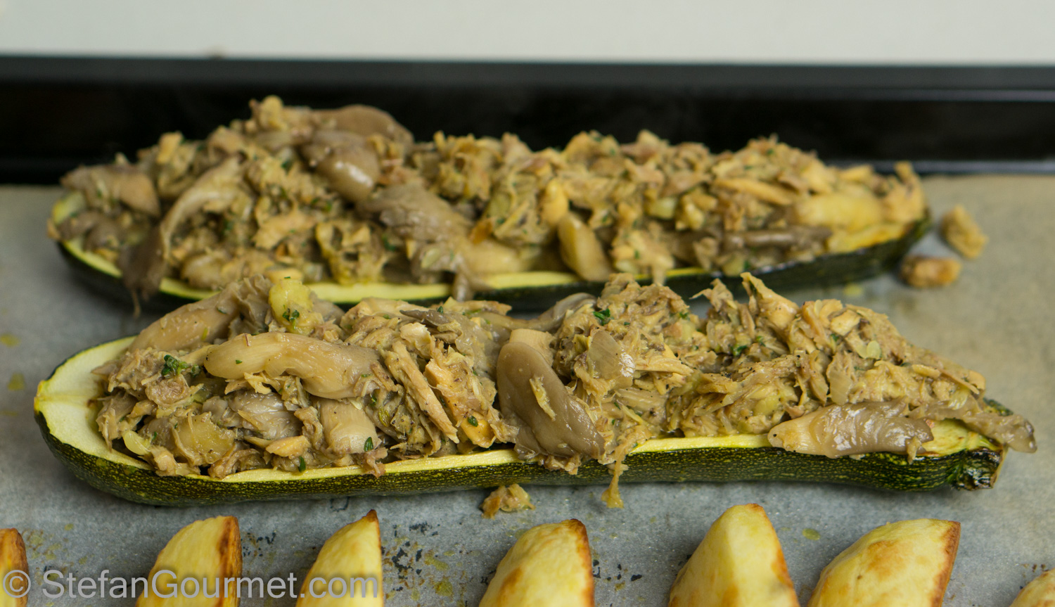 I ended up using the leftover chicken meat to stuff a zucchini, together with oyster mushrooms and topped with cheese. The result was pretty nice, and you could definitely make this with regular chicken meat as well. As expected, the chicken meat leftover from making stock doesn’t have a lot of flavor, but the texture is fine and adding the leftover chicken stock helped. You may get a better result by roasting the carcass and picking the meat rather than making stock as well, but then you won’t have stock for the sauce like I did. I served this with roasted potatoes and it was a nice meal. Here’s what I did…