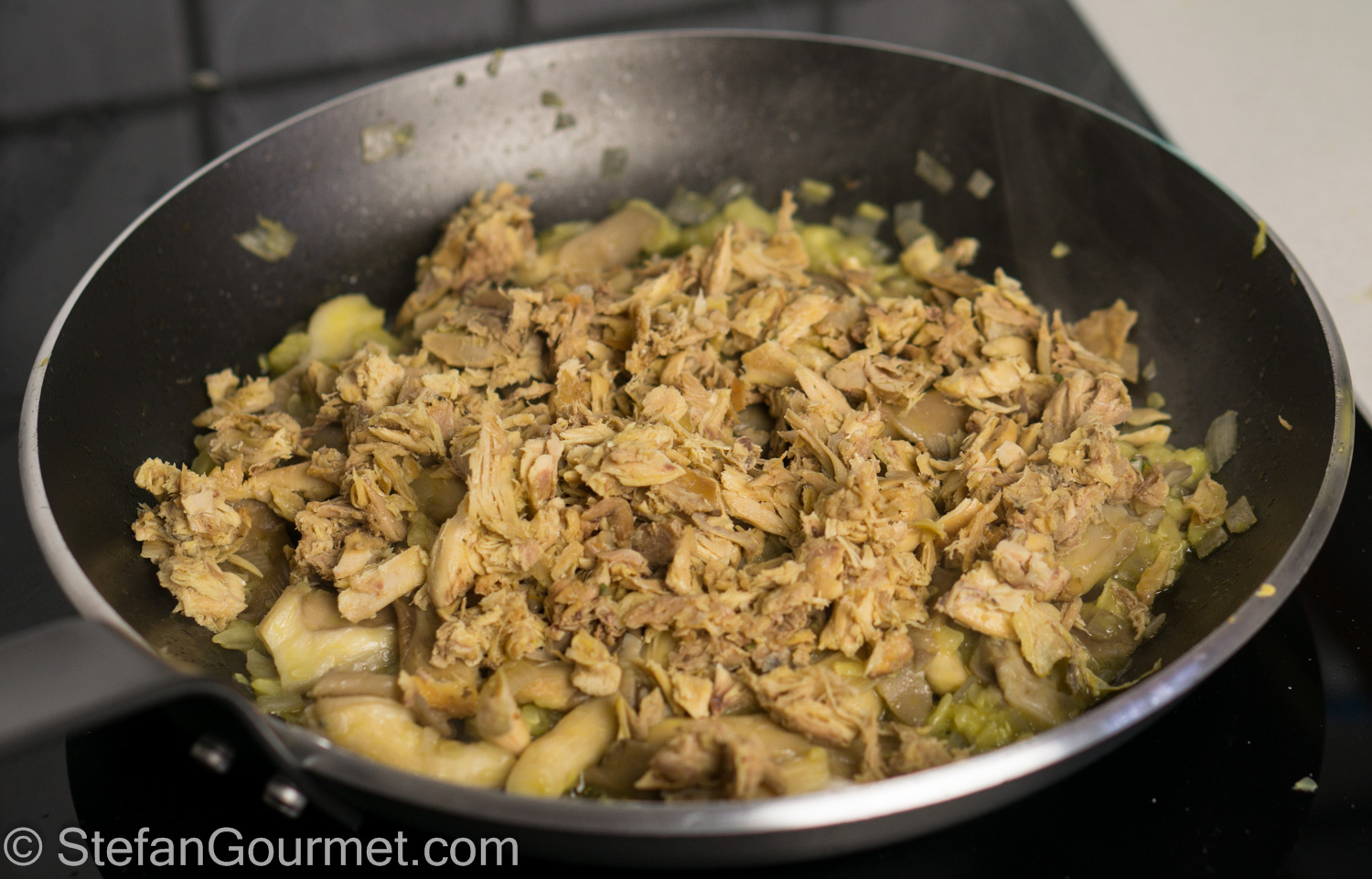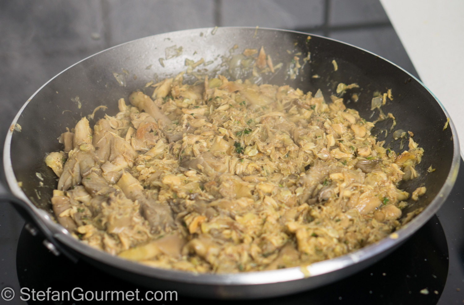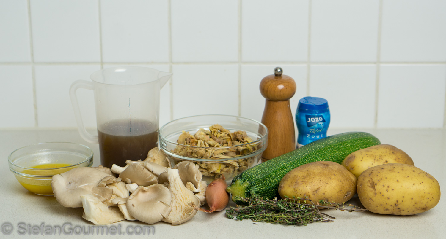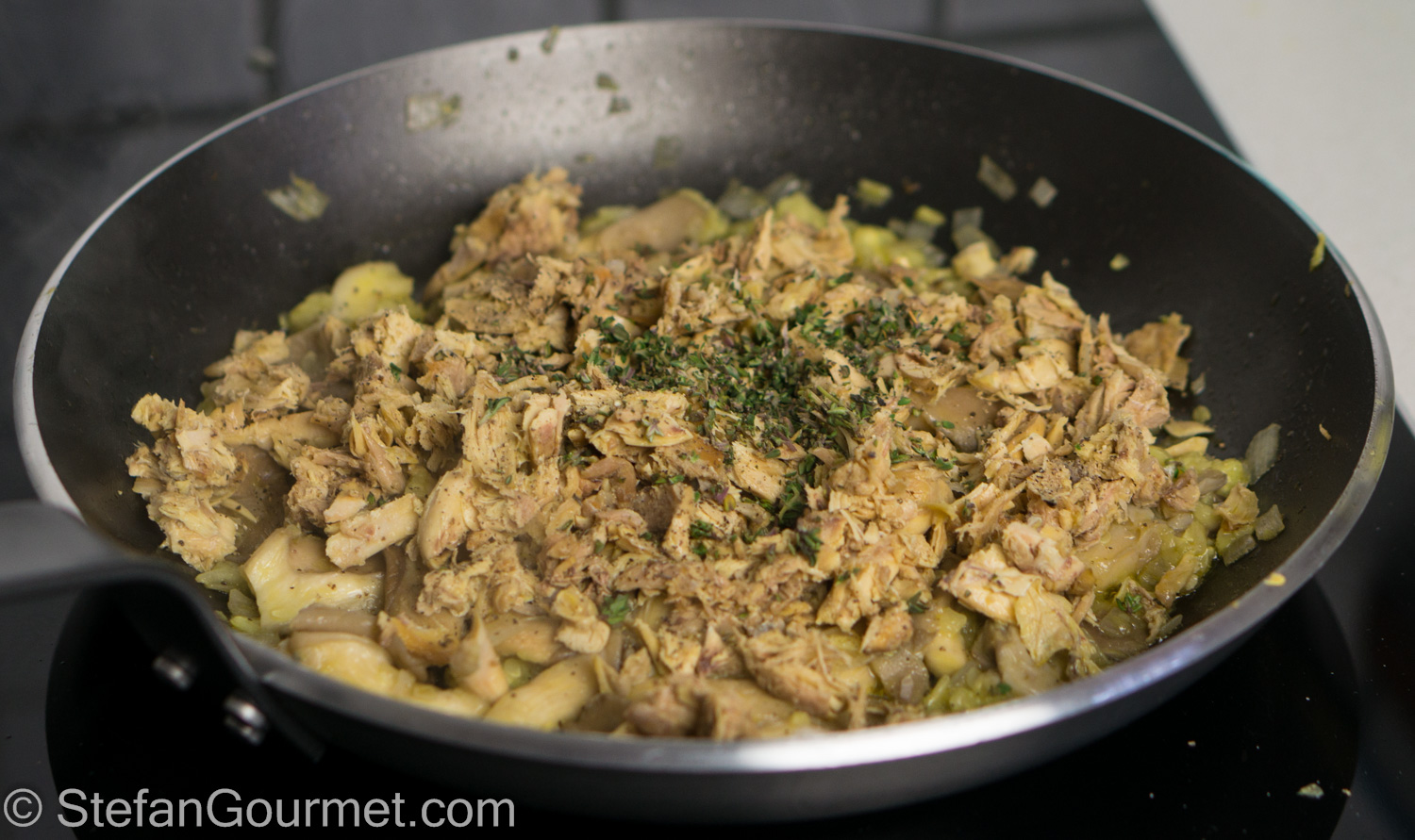 I ended up using the leftover chicken meat to stuff a zucchini, together with oyster mushrooms and topped with cheese. The result was pretty nice, and you could definitely make this with regular chicken meat as well. As expected, the chicken meat leftover from making stock doesn’t have a lot of flavor, but the texture is fine and adding the leftover chicken stock helped. You may get a better result by roasting the carcass and picking the meat rather than making stock as well, but then you won’t have stock for the sauce like I did. I served this with roasted potatoes and it was a nice meal. Here’s what I did…