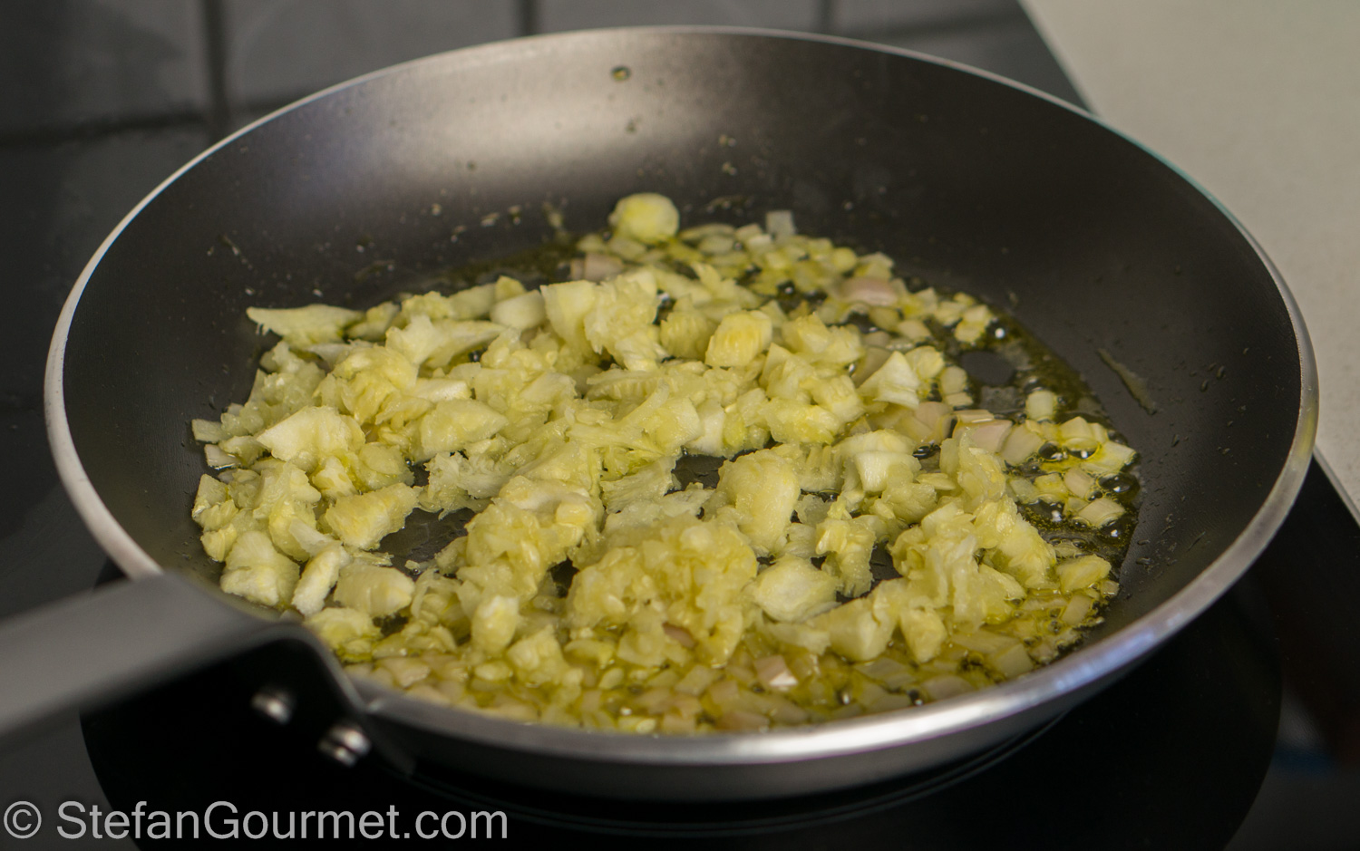 Meanwhile, heat the remaining 2 Tbsp of chicken fat in a frying pan. Add the shallot and sauté until translucent.