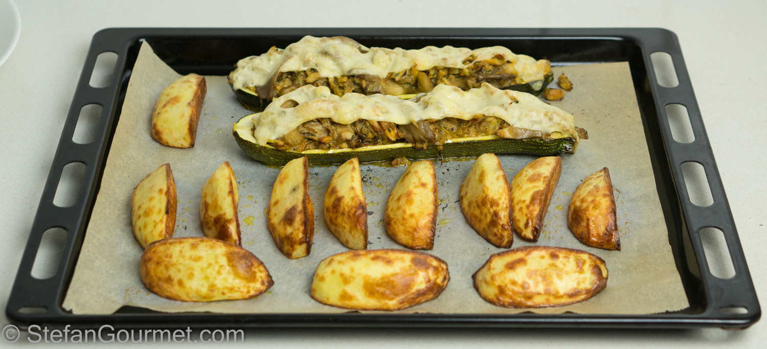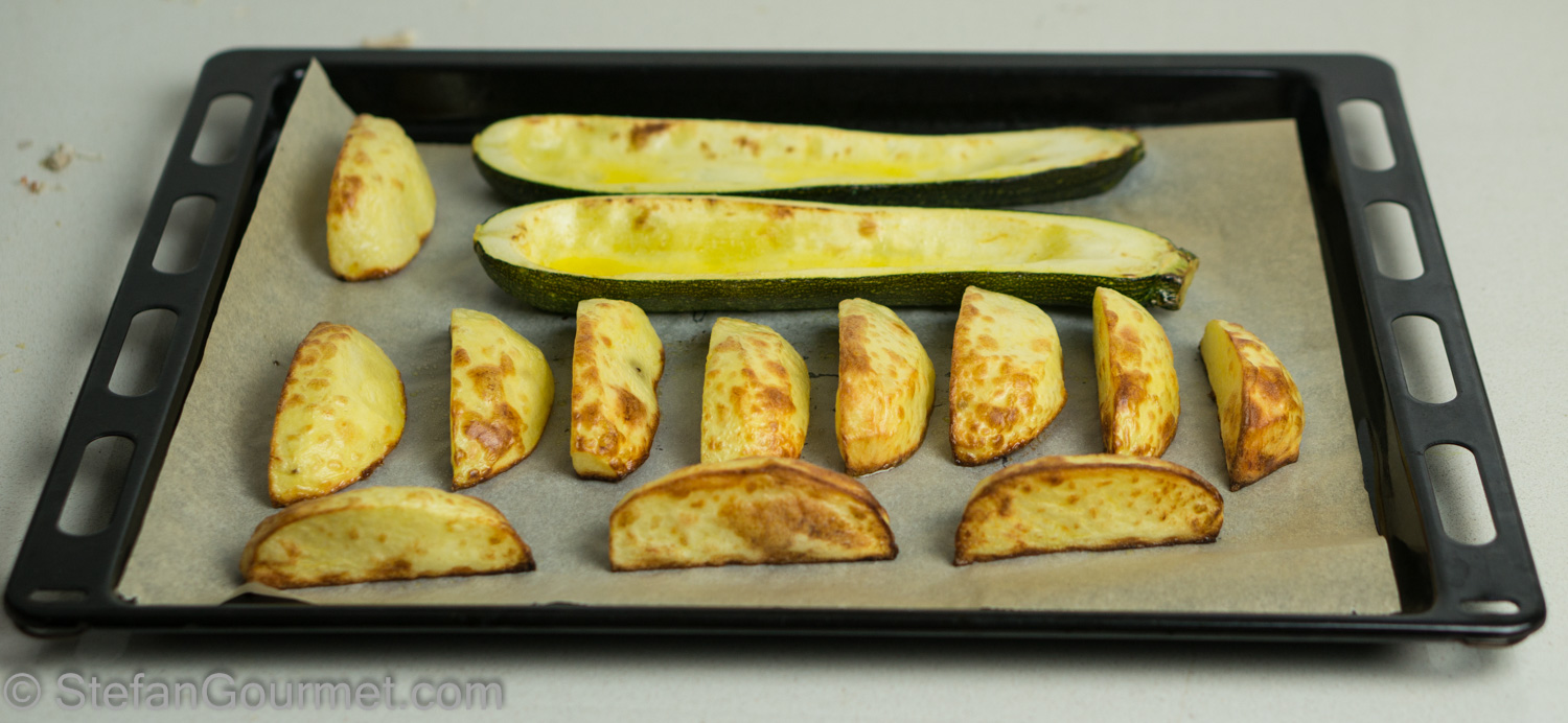 Roast for about 20 minutes at 225ºC/440ºF until the potatoes and zucchini are golden.