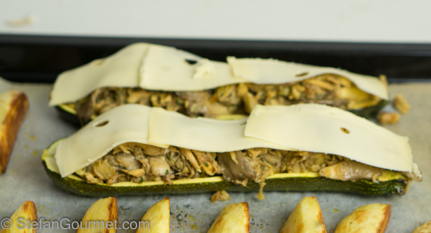 By now the zucchini should be coming out of the oven. Stuff the zucchini with the chicken mixture…