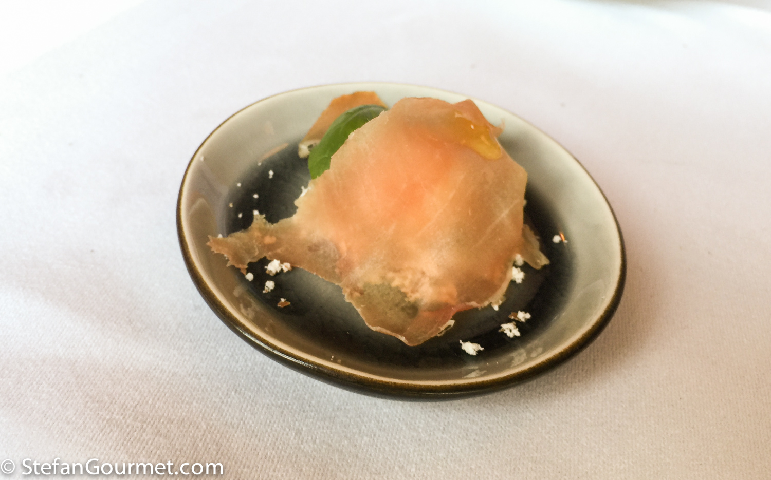 The amuse bouche: melon ice cream with prosciutto, basil, and olive oil crystals. Although the combination of flavors isn’t as original as the other dishes that will follow, it was one of my favorites of the evening with great flavor and play of textures and temperatures. (9/10)