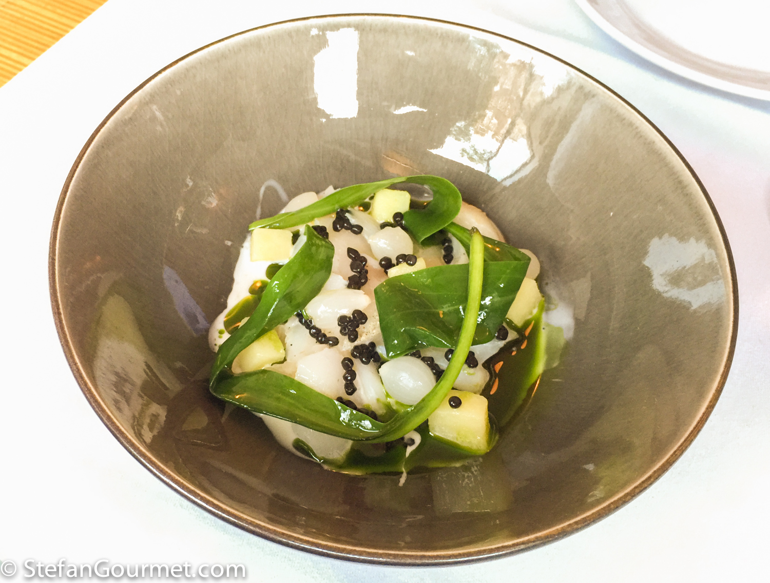 First course: steamed cod with potato, herring caviar, pearl onions, sea aster leaves, and chlorofyl, served with a glass of Riesling from Pfalz. An original dish in which the flavors worked very well together, with a nice contrast between soft and mellow textures and flavors and crispy and fresh textures and flavors. 9/10