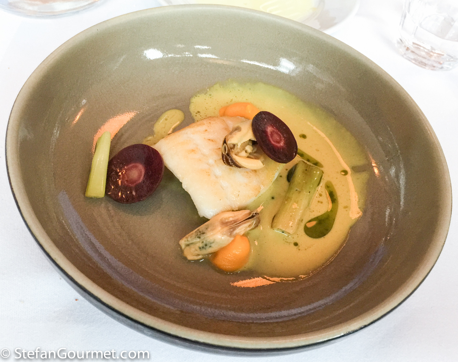 Second course: turbot with carrots, mussels, yellow curry, and leeks, served with a glass of Arinto from Portugal. Again original and quite nice. 8/10