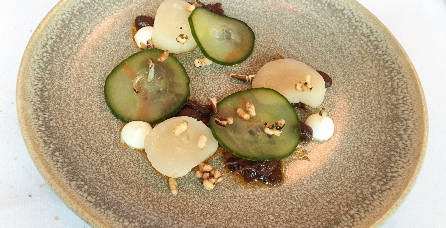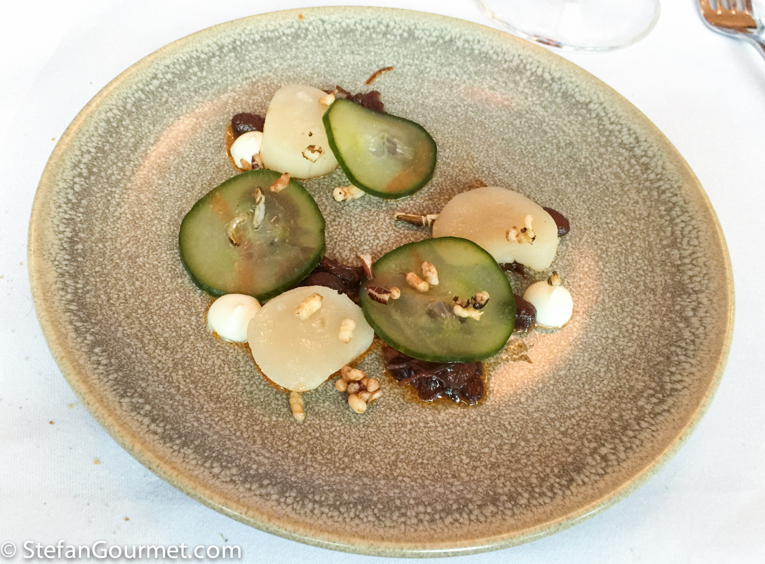 Third course: raw scallops with slightly pickled cucumber and XO sauce, a spicy seafood sauce from Hong Kong, served with a glass of slightly chilled Spätburgunder (Pinot Noir). A very original dish and a very original wine pairing (that did work). The XO sauce dominates the dish a bit, but the combination does work well. The scallop provides more of a textural element. 9/10