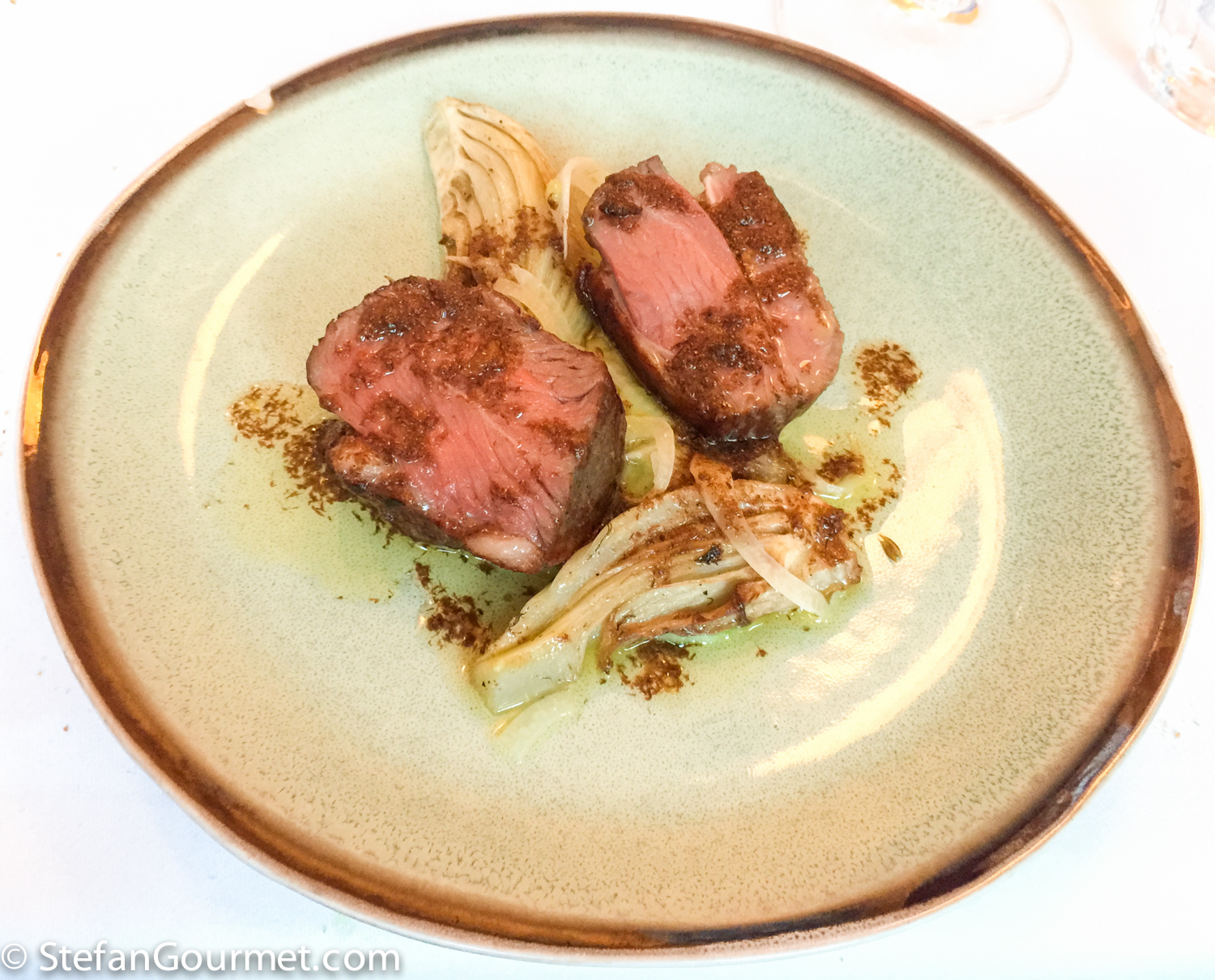 Fourth course: lamb with two preparations of fennel and beurre noisette, served with a glass of Grenache/Syrah from the Rhone. The lamb was perfectly cooked and the fennel, which can easily become bland, had a good fennel flavor. This original combination of lamb and fennel worked very well. Beurre noisette usually isn’t served in such a separated state, but it is a nice addition to the flavor profile. 8/10