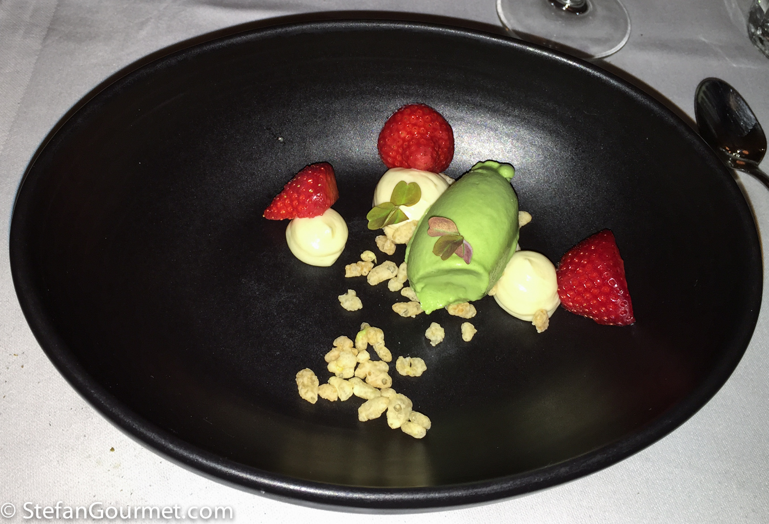 Fifth course: sorrel ice cream with strawberries and crispy rice, served with a glass of Brachetto d’Aqui. The waiter asked us to guess the flavor of the ice cream, and we failed miserably. The ice cream was nicely tart and again original. 8/10