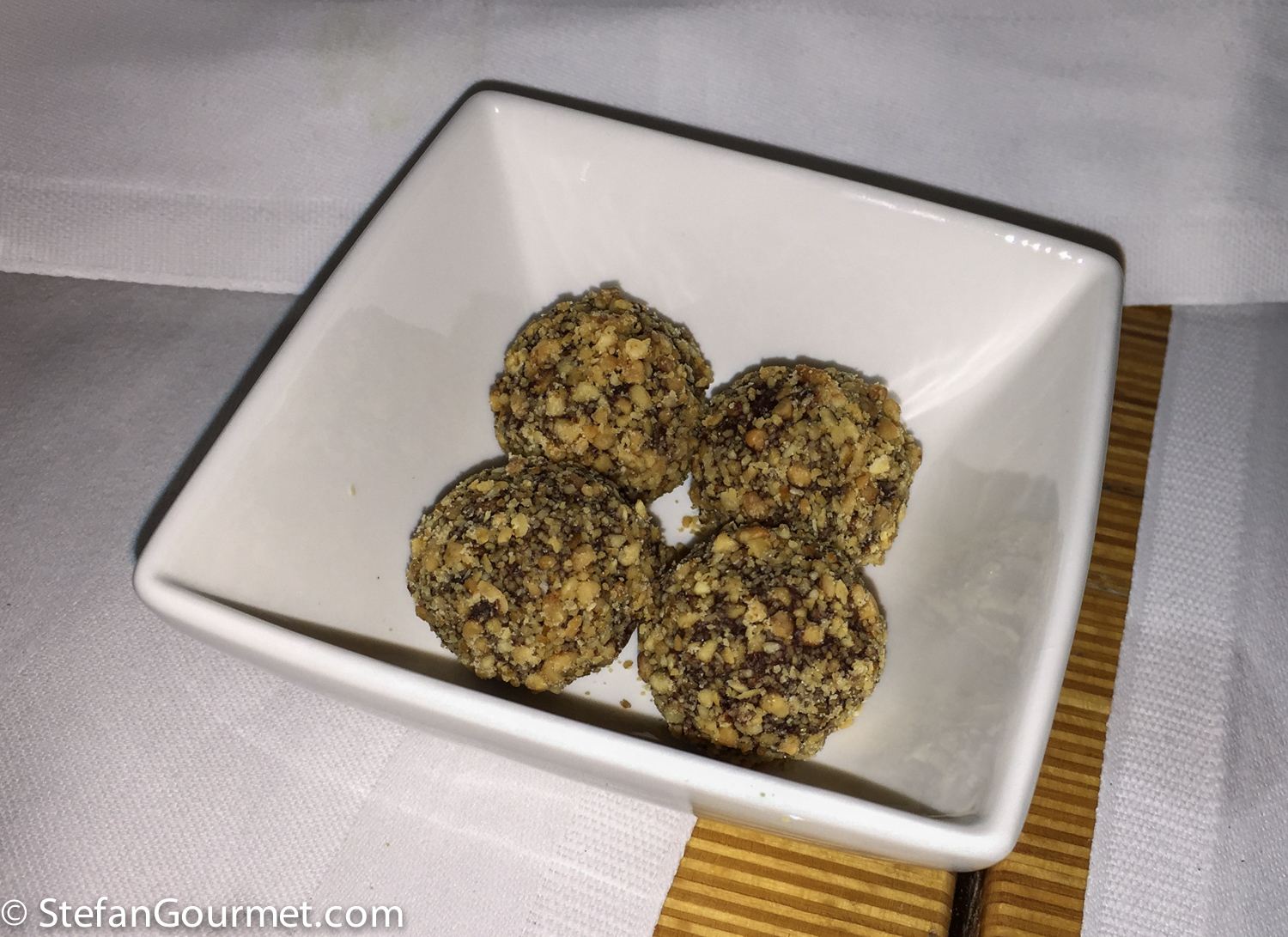 These chocolate-peanut balls, stuffed with caramel, were served with the coffee. Very nice.