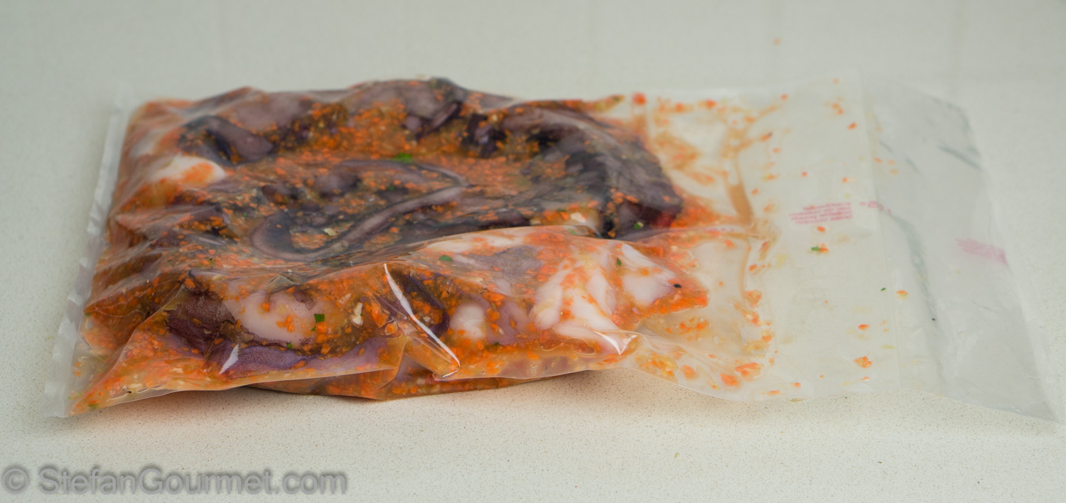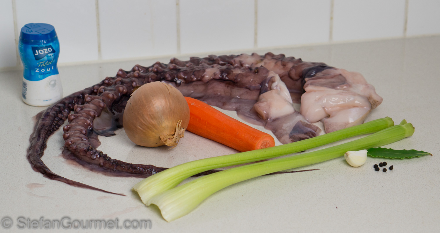 Vacuum seal 1 kg (2.2 lbs) octopus legs with the vegetable mixture as well as some salt and 6 black peppercorns.