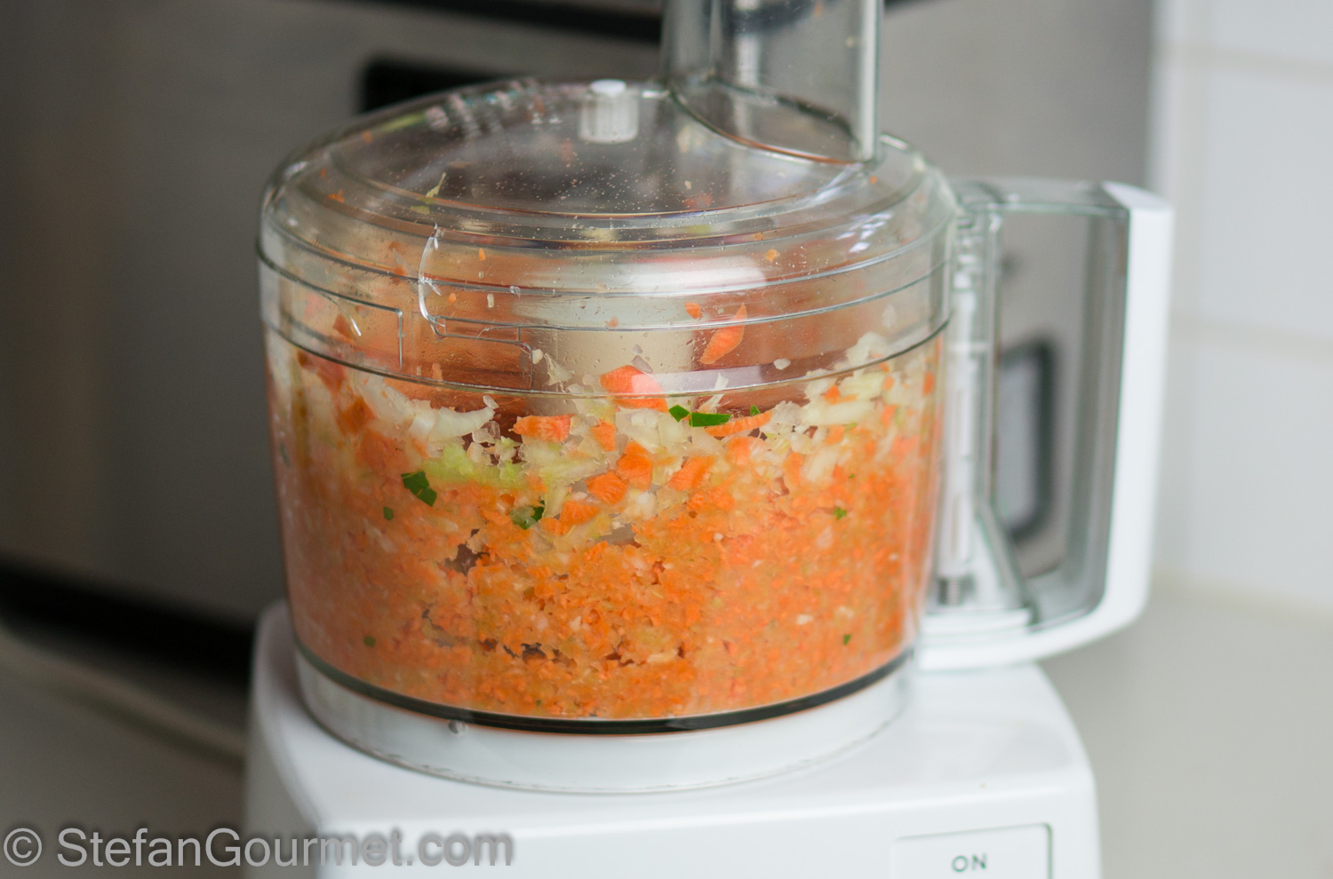Mince 1 carrot, 1 onion, 2 celery stalks, 1 clove garlic, and 1 bay leaf. I use the food processor to do this quickly.