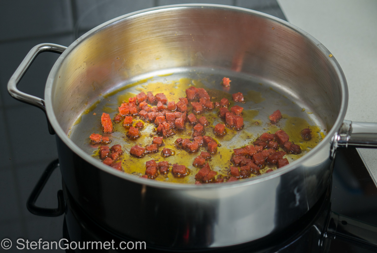 Cook 50 grams (1.8 oz) diced chorizo in a frying pan with a tablespoon of olive oil until golden.