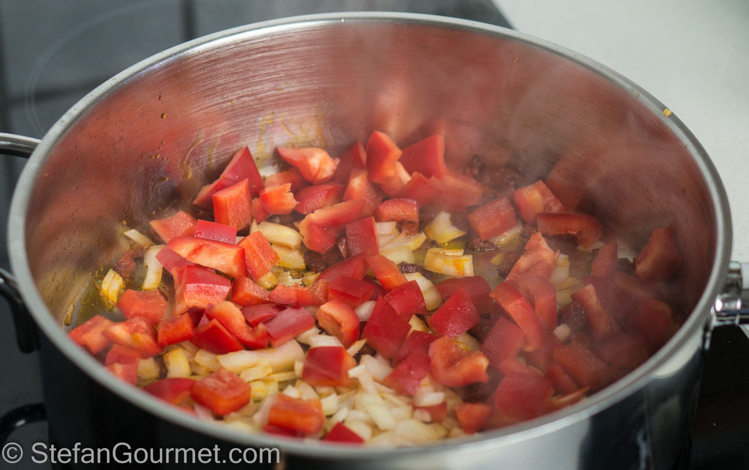 Add 1 bell pepper, diced and 1/2 onion, minced.