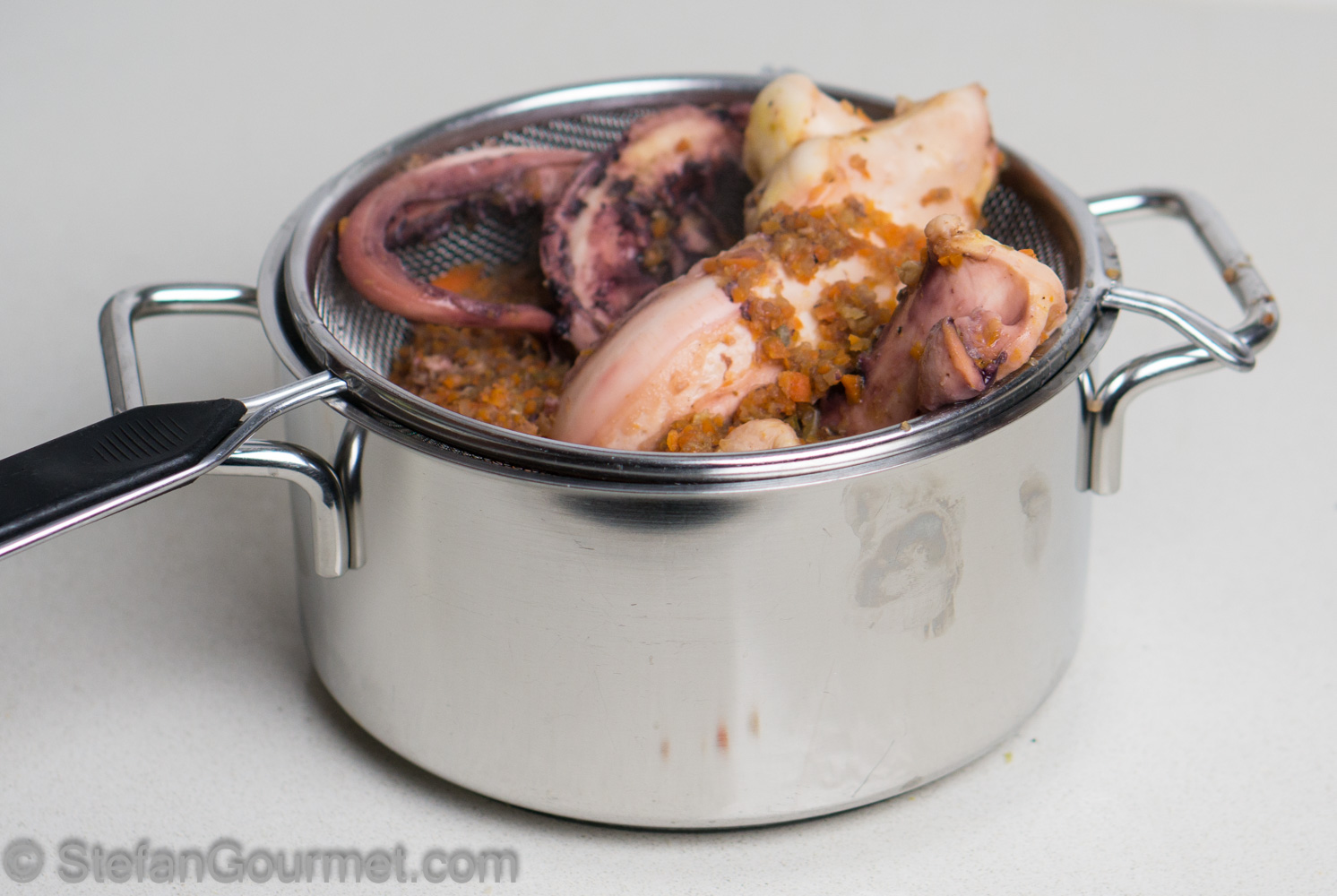 Put the octopus ‘stock’ in a pot and keep it simmering. Reserve the octopus.