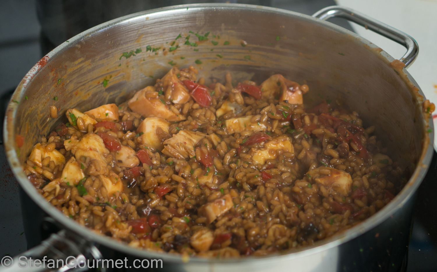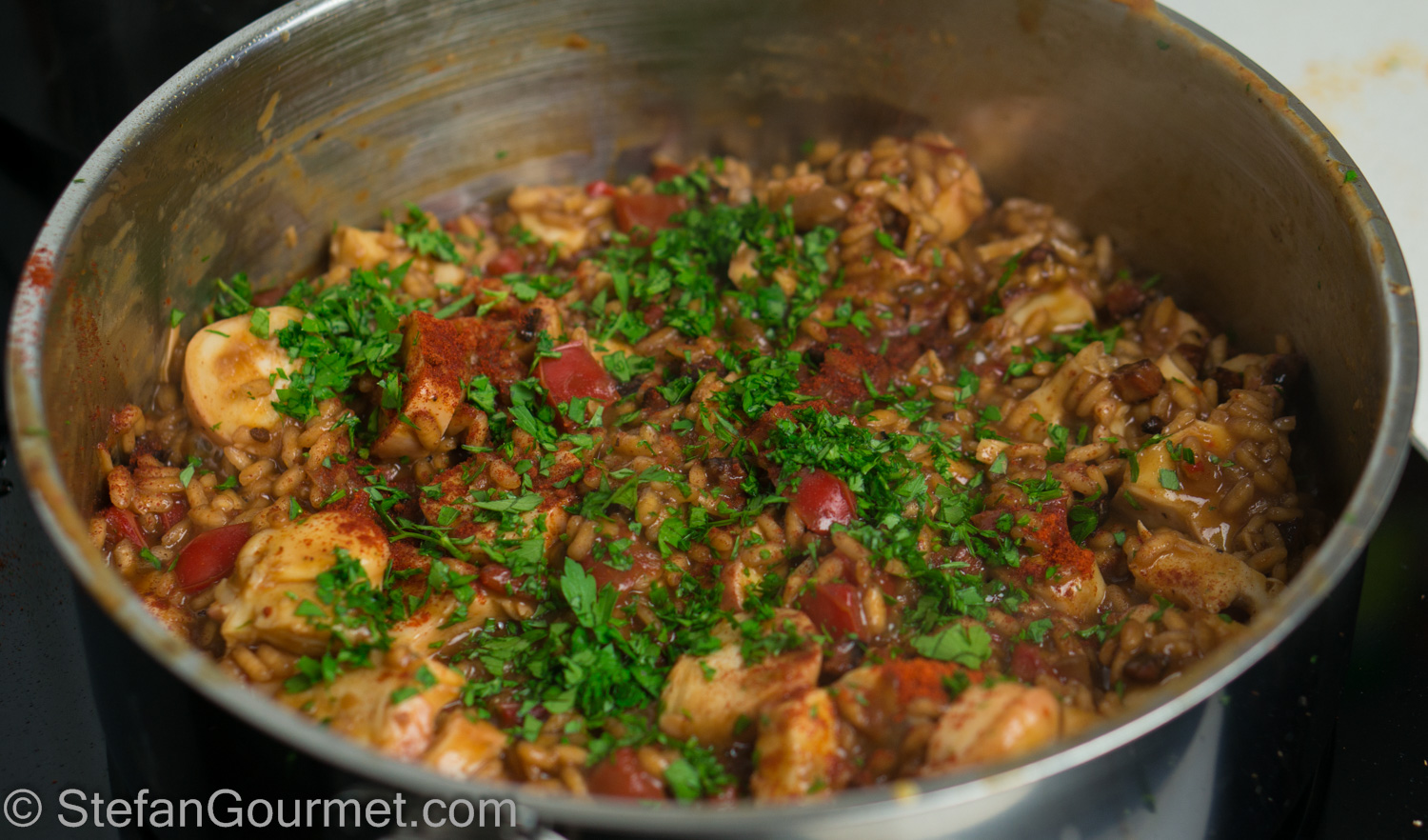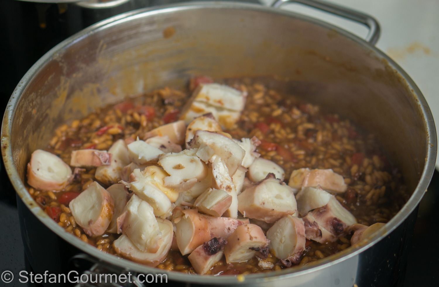 I love it when a reader reports about having tried a recipe from this blog, and even more so when they post a picture on Stefan’s Gourmet Blog’s Facebook page. Jev Kuznetsov did something similar, as he started with my recipe for octopus sous-vide, and then used it to make risotto with chorizo. I really liked that idea, and so I made this as well.