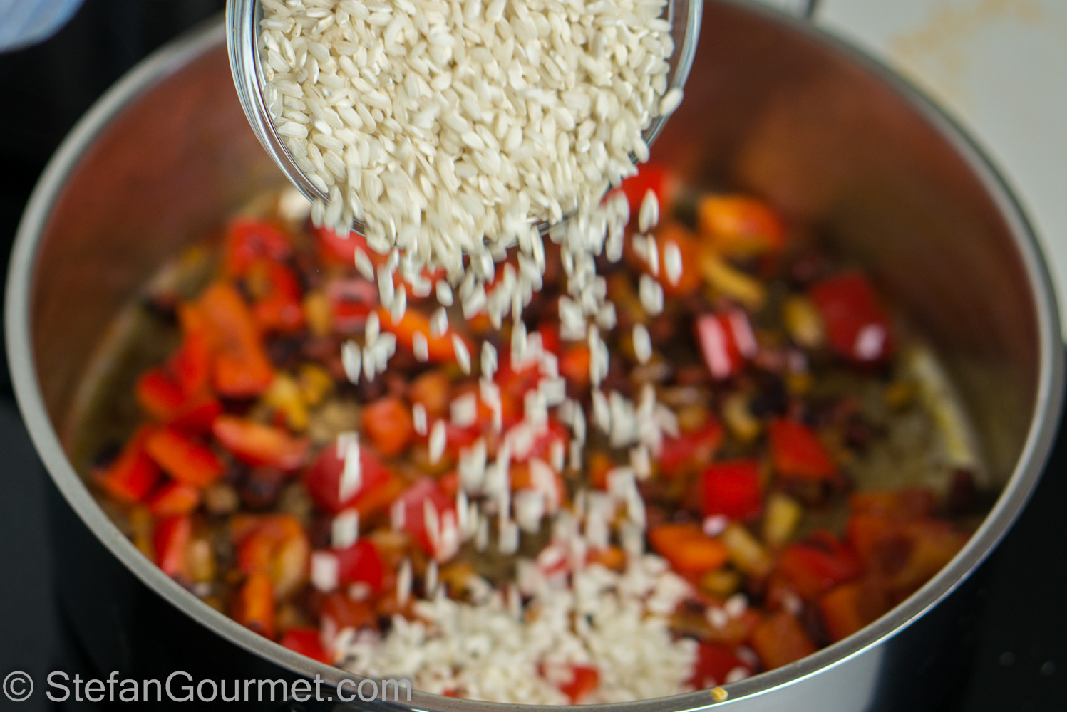 Add 130 grams (2/3 cup) risotto rice…