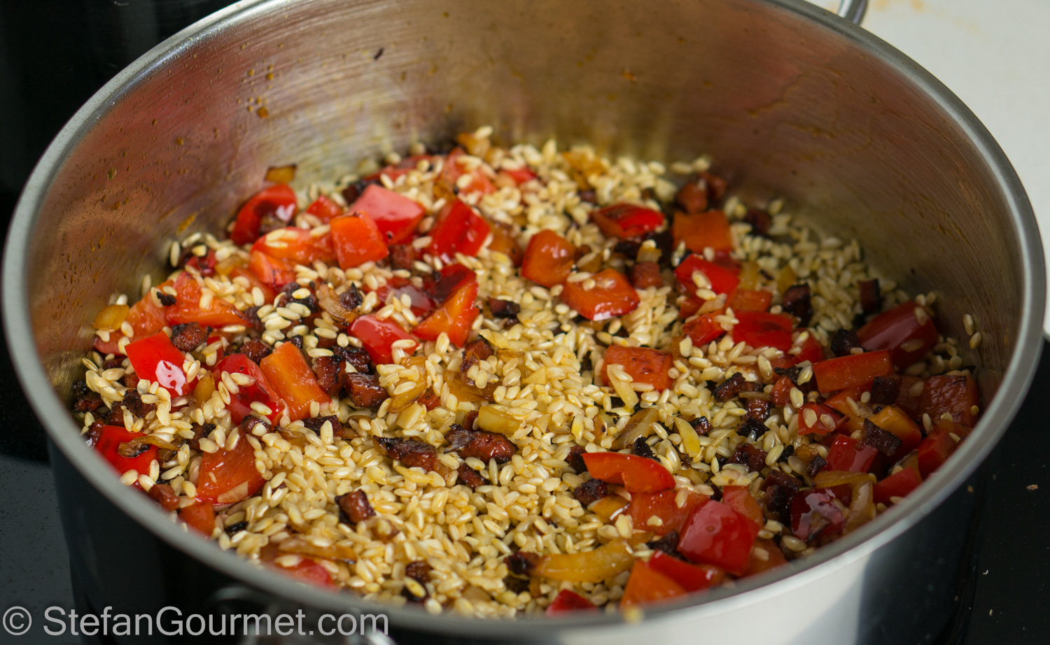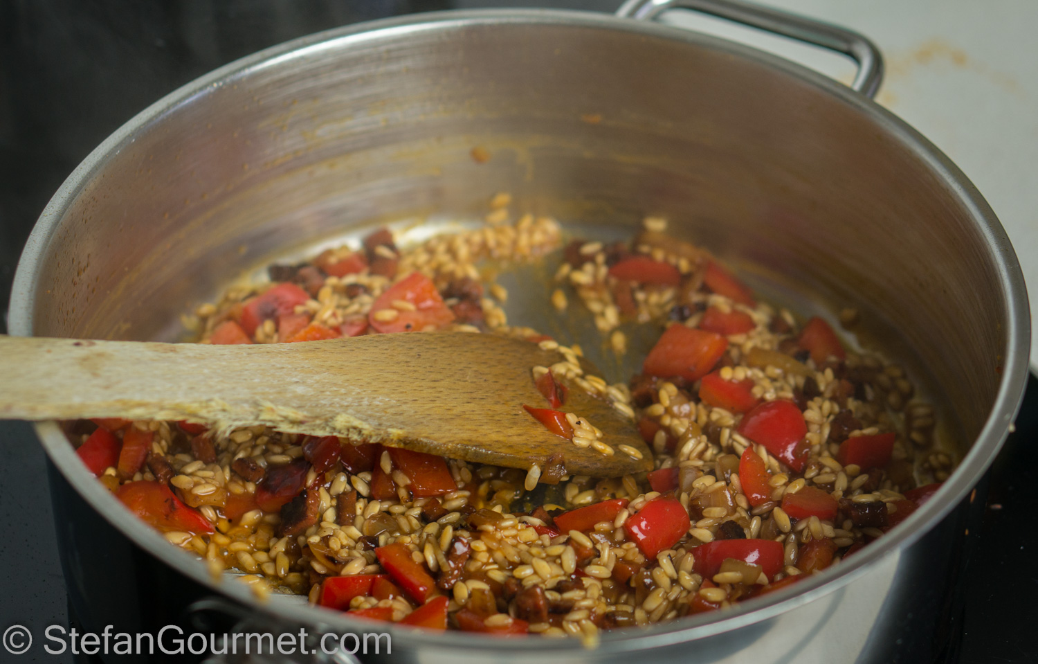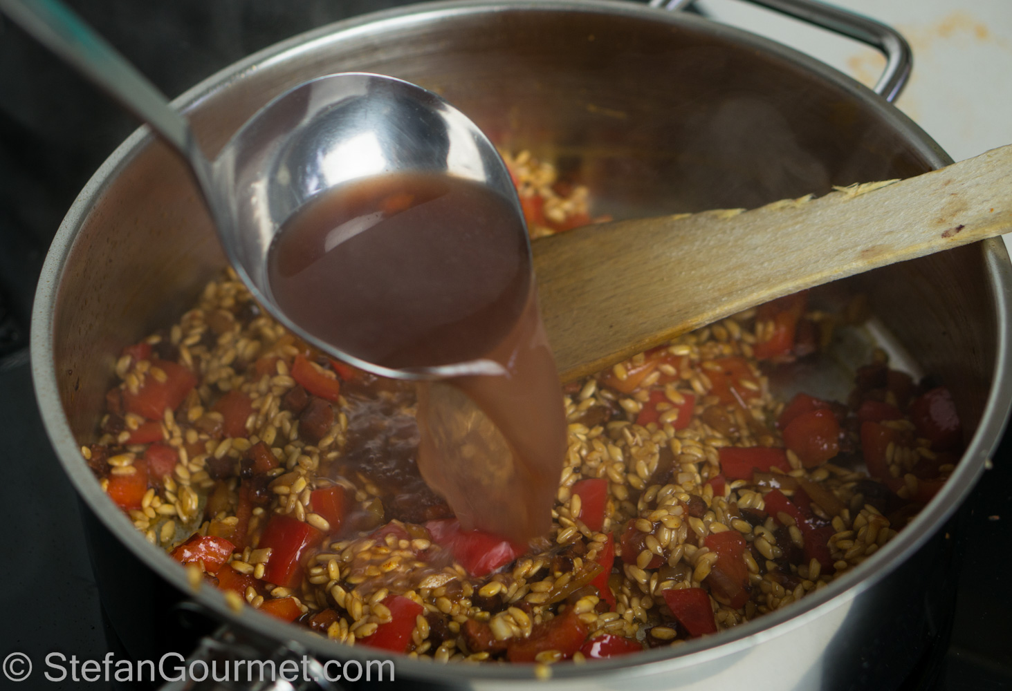 …and 1/4 tsp of smoked paprika. Stir over medium heat until the wine has been absorbed.