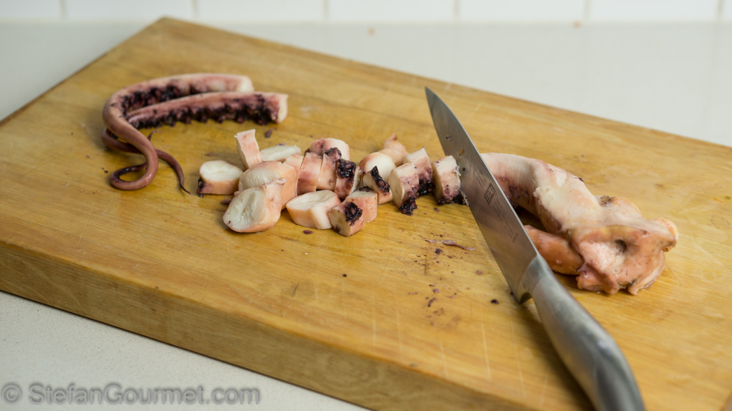 Chop the octopus, keeping the ends for garnish.
