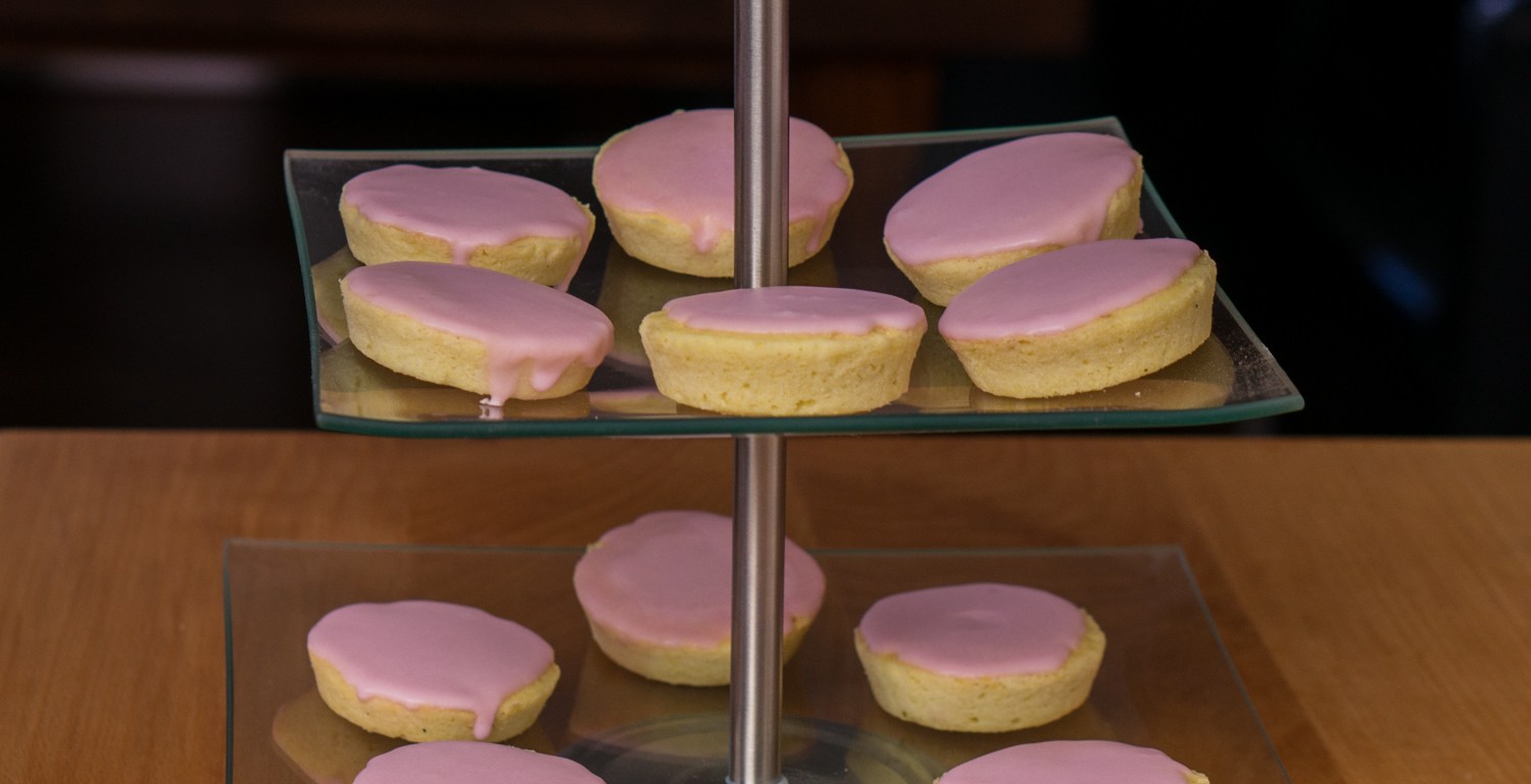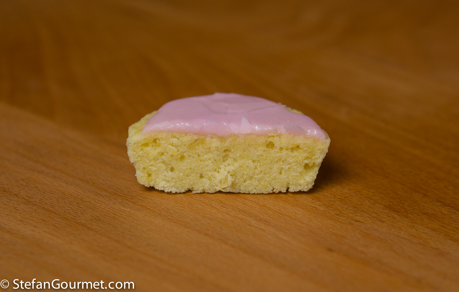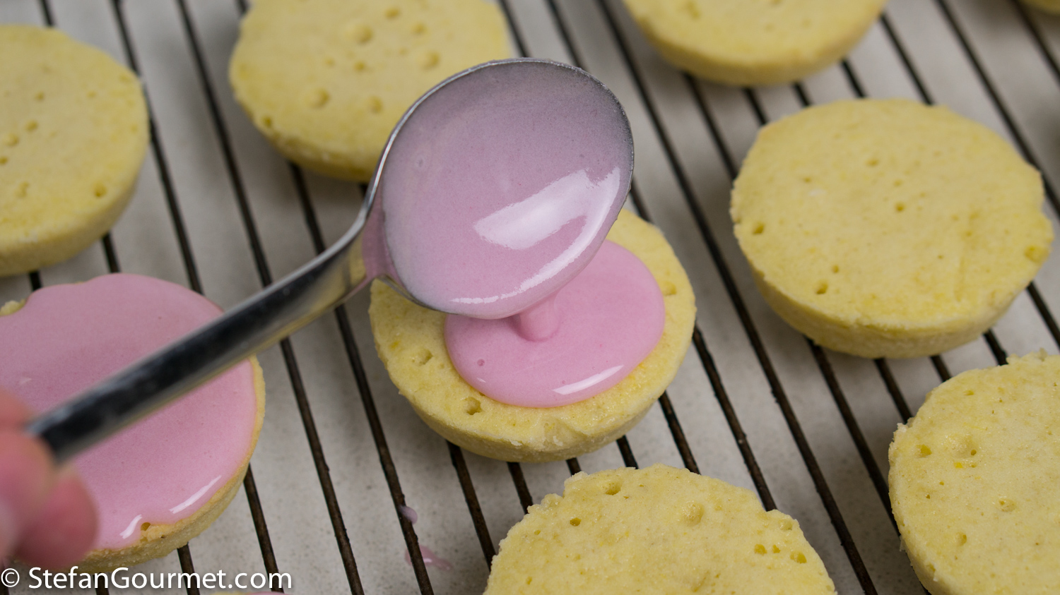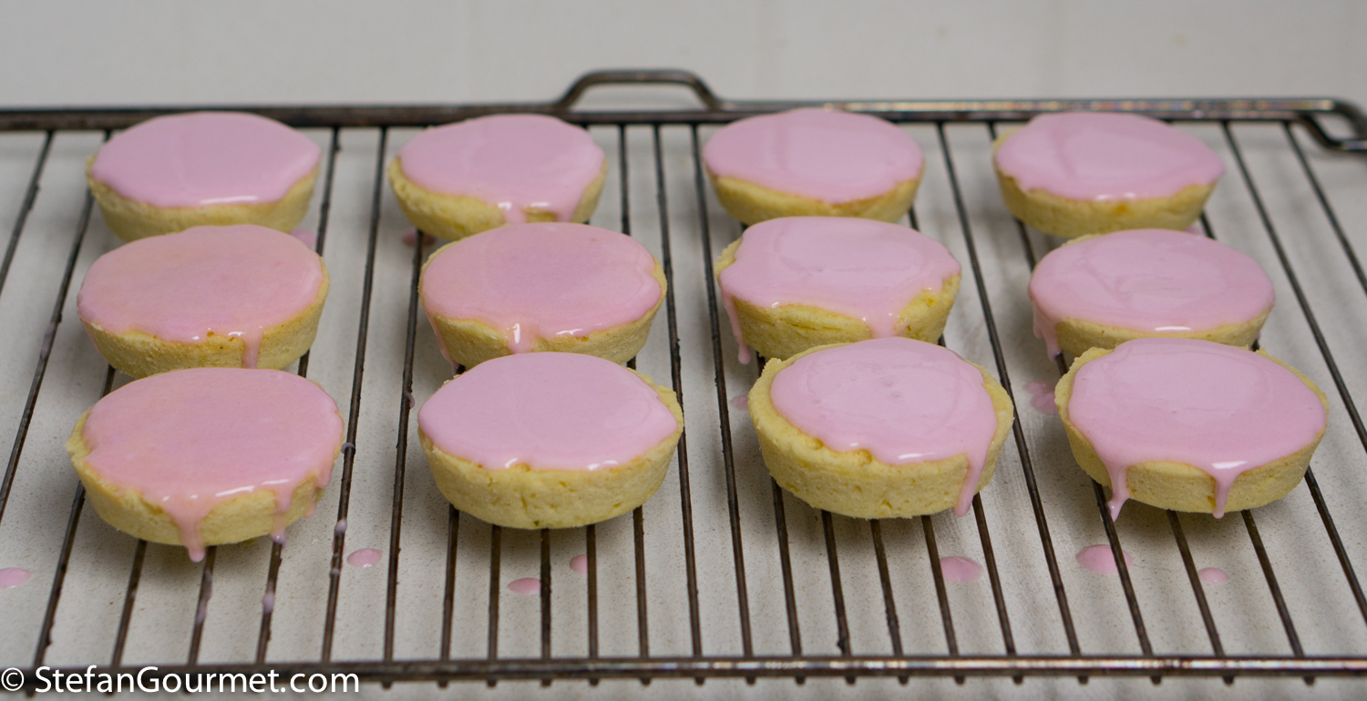 They are quite easy to make. The base is very similar to that of pound cake, but the baking powder should be left out as we want to bake cookies, not muffins. For the glaze I made an egg white-based “royal” glaze and colored it with raspberries (instead of red food coloring, carmine, which is made from insects). This also gives the glaze a nice raspberry flavor.