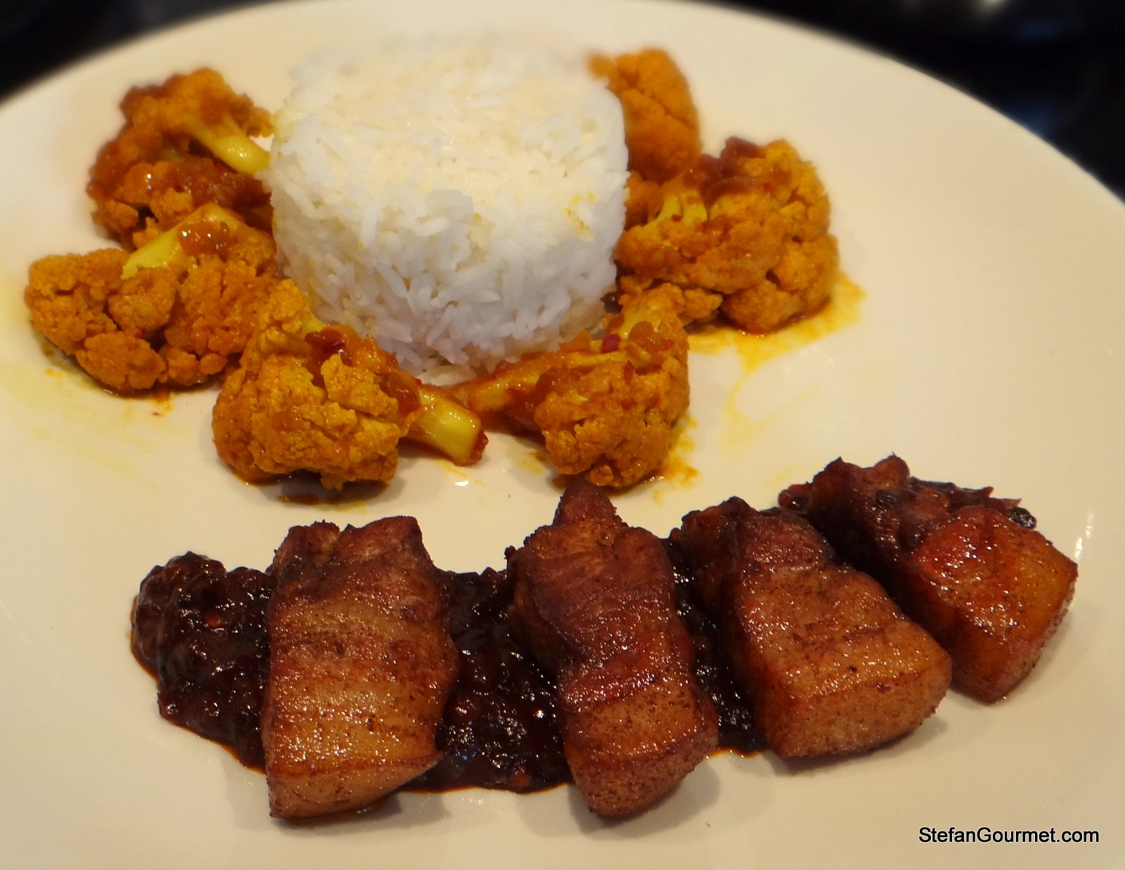 Spicy Sweet & Sour Pork Belly and Cauliflower is bursting with flavor. It starts with pork belly cubes cooked sous-vide with 5-spice. (You can also prepare this without a sous-vide cooker, though.) The pork is then deep fried briefly to crisp it up. The juices from the pork belly are used to create a darkly flavored sweet & sour sauce that is bursting with flavor from sambal oelek, fresh ginger, and caramelized onions. This sauce pairs well with the juicy tender pork belly. As a contrast to the deep dark flavors of the sauce, atjar-inspired spicy sweet & sour cauliflower that is equally bursting with flavor, but in a different fresher way. Served with some rice, this was one great meal! I have made this dish more often, and it has always been a success.