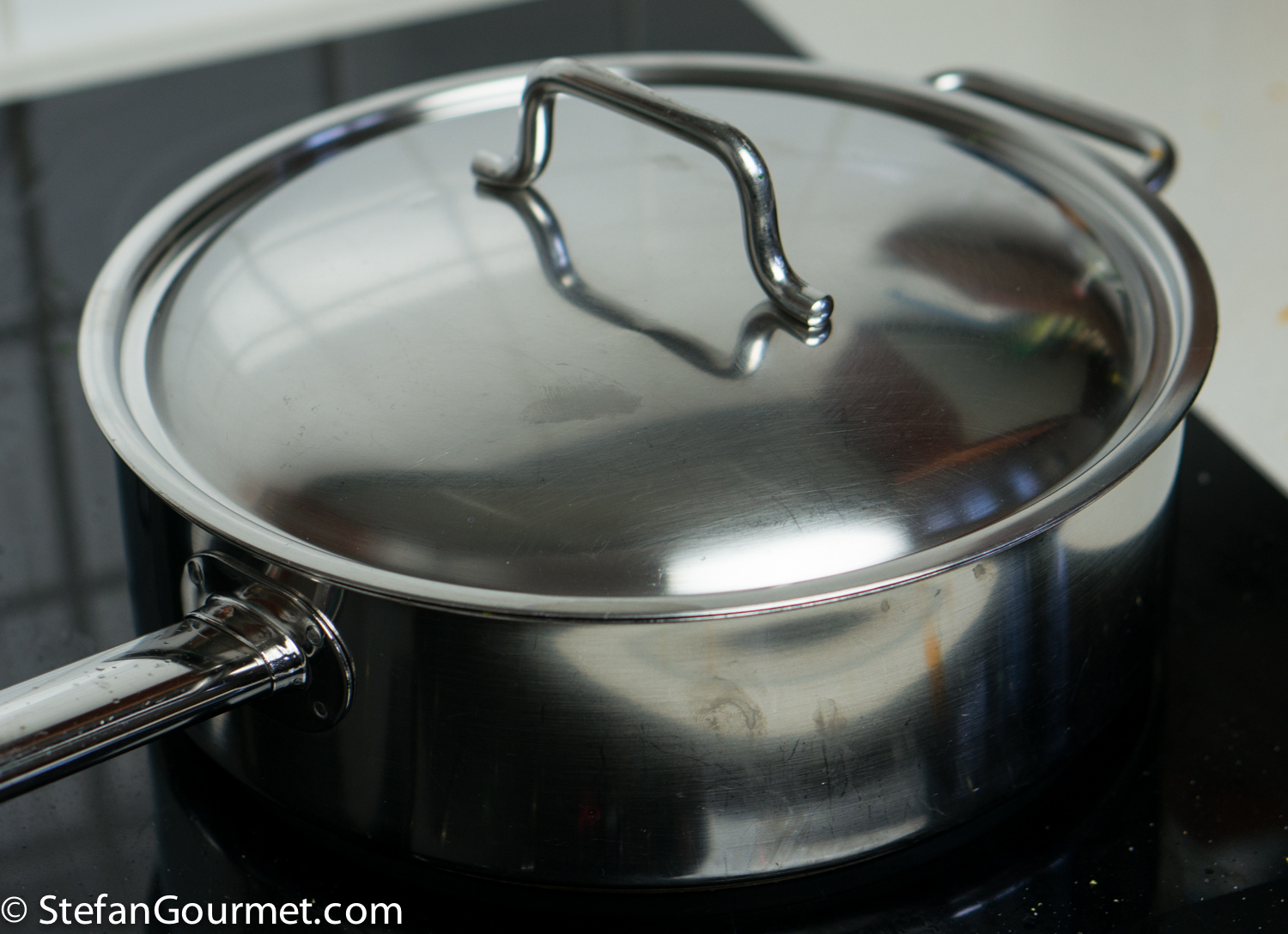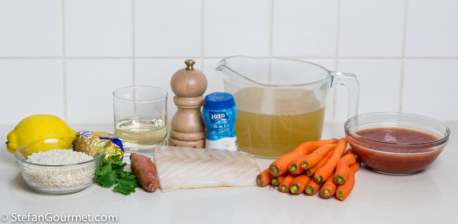 Doesn’t this risotto have a great color? I had some carrots, some fish stock, and some canned tomatoes I needed to use up, and thus this risotto was born. The cod was a nice addition that I bought especially for the dish. The flavor combination of carrot with lemon and cod works well, although it doesn’t have a pronounced carrot taste if that is what you’re looking for. I’d say adding the tomatoes is optional. It deepens the color and adds some umami, but is not really necessary. I used it because it needed to be used up. The cod is cooked in the hot risotto while it rests. That way, the cod is tender and juicy instead of dry and flaky. The carrots are steamed above the fish stock, so any flavor leaking from the carrots will end up in the risotto anyway. Here’s what I did…