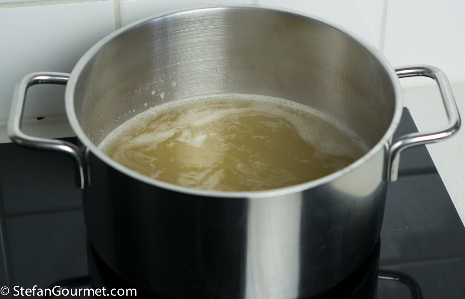 Bring about 700 ml (3 cups) fish stock to a boil…