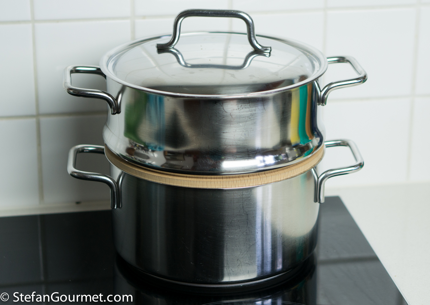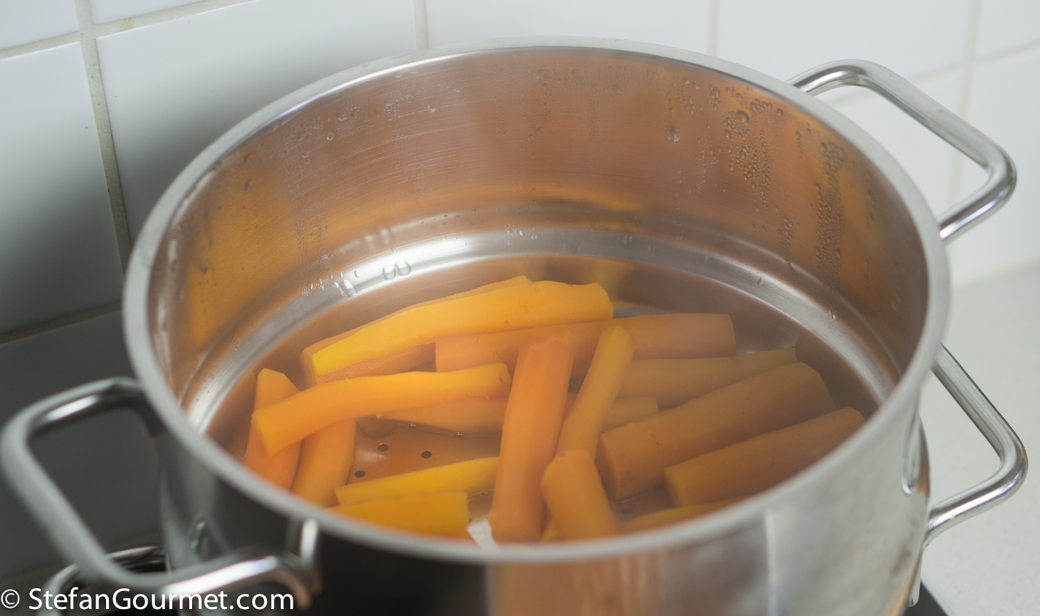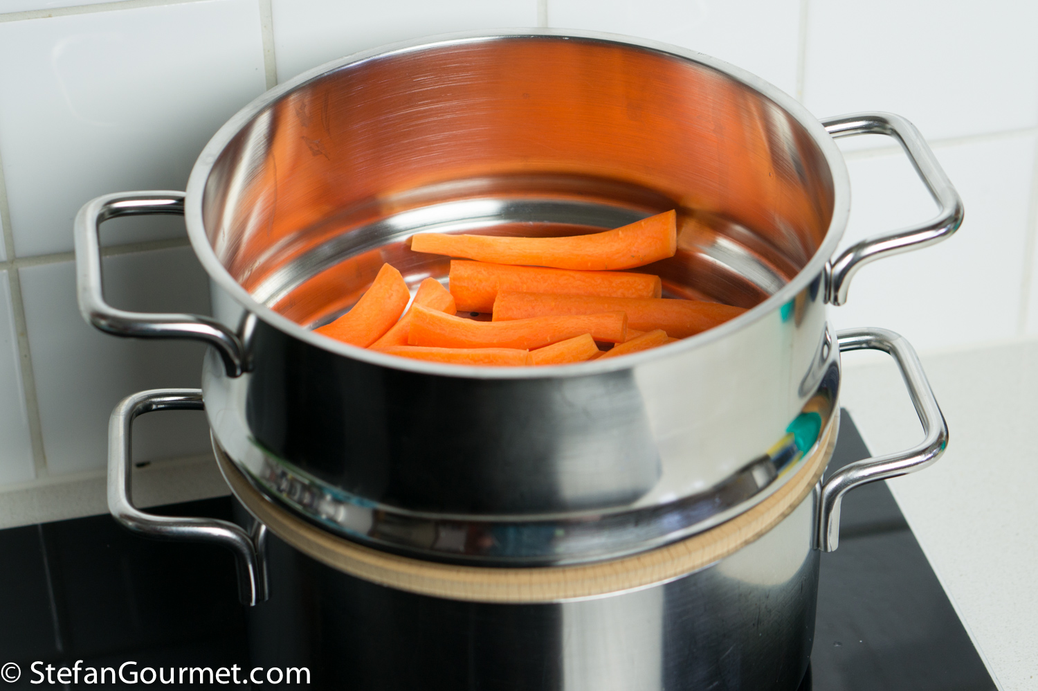 …and put 400 grams (.9 lb) of peeled carrots above it in a steaming basket.