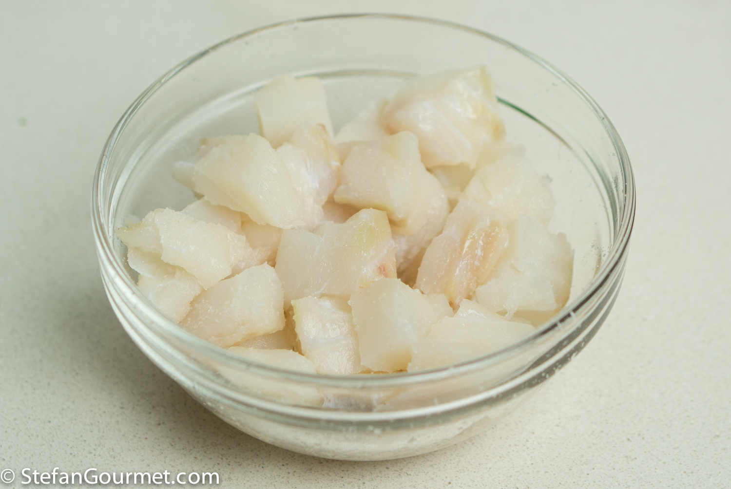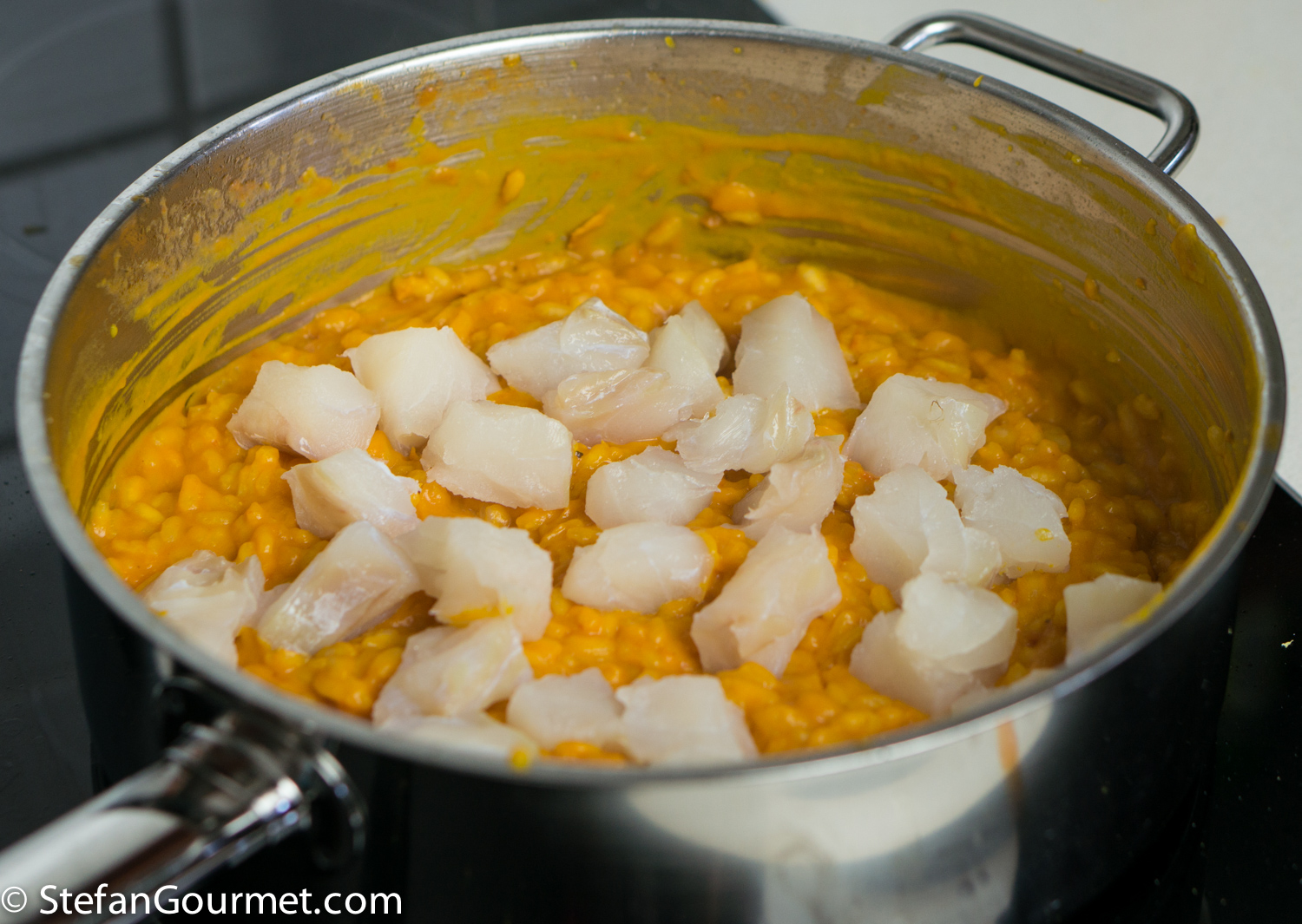 Dice 300 grams (.66 lb) of cod, put it in a bowl with 1/2 tsp of salt and mix. Allow the salt to penetrate into the fish while you make the risotto.
