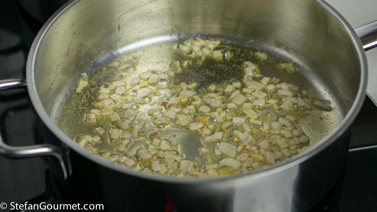 Melt 2 Tbsp of butter in a wide shallow thick-bottomed pan, and add a minced shallot. Stir for a couple of minutes over medium heat or until the shallot is translucent.