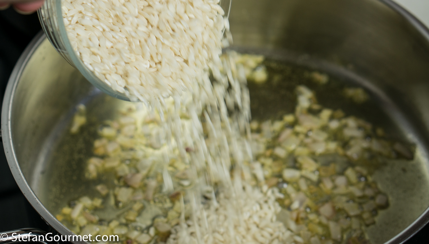 Add 130 grams (2/3 cup) of risotto rice, and stir for a couple of minutes over medium heat or until the rice is very hot.