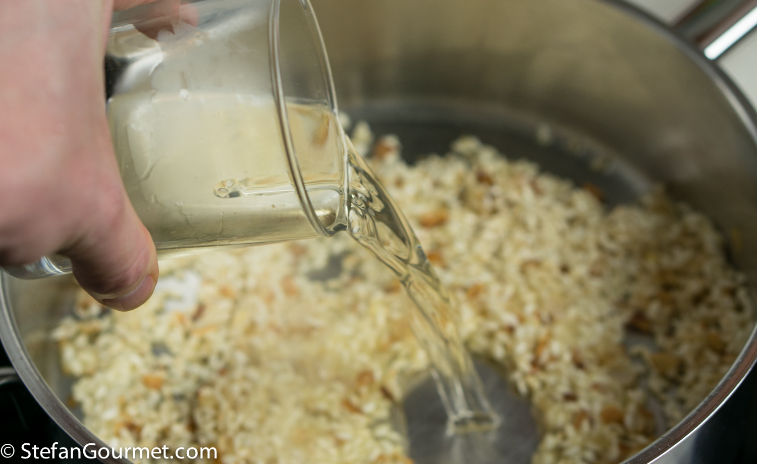 Add 80 ml (1/3 cup) of dry white wine, and stir until the wine has been absorbed by the rice.