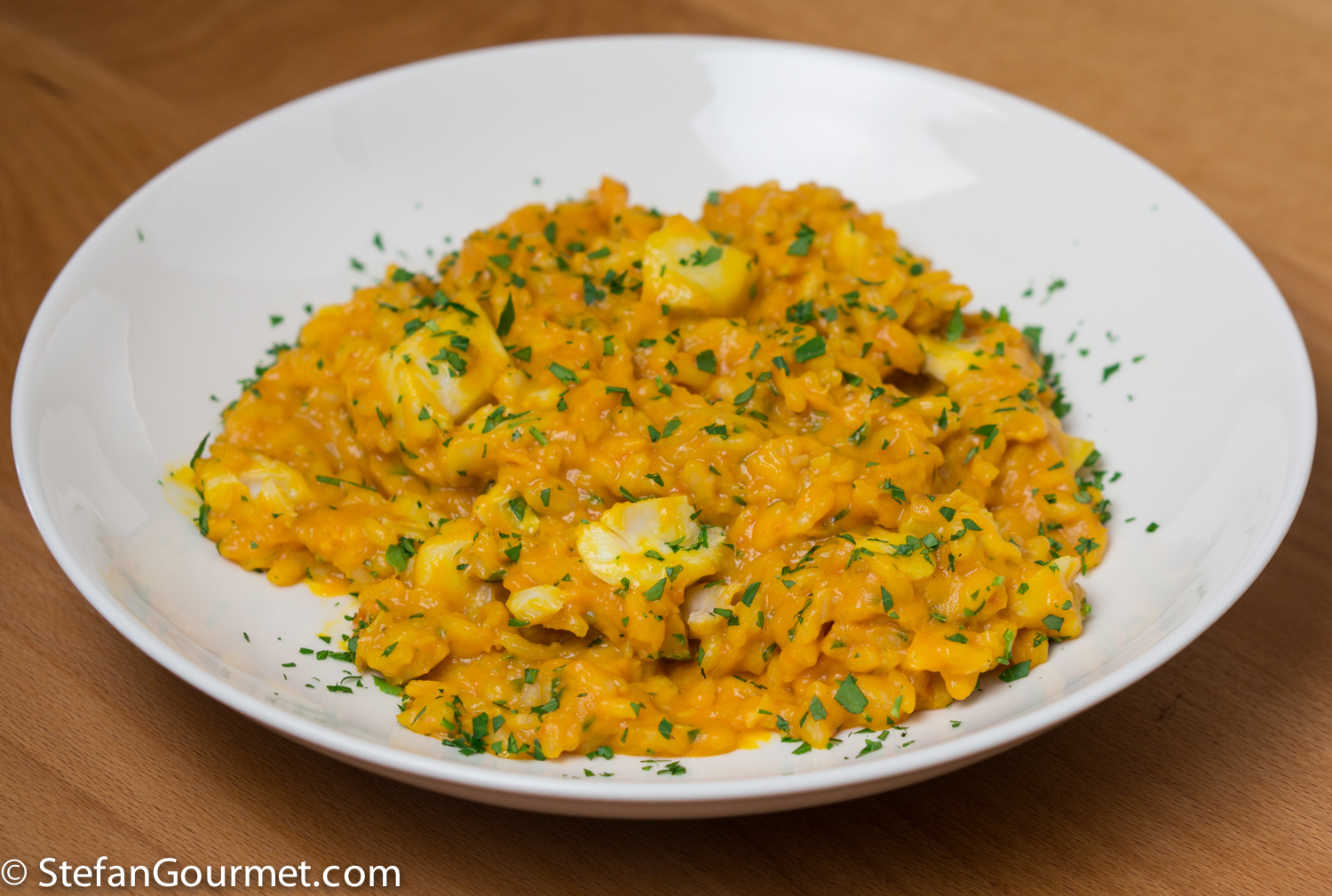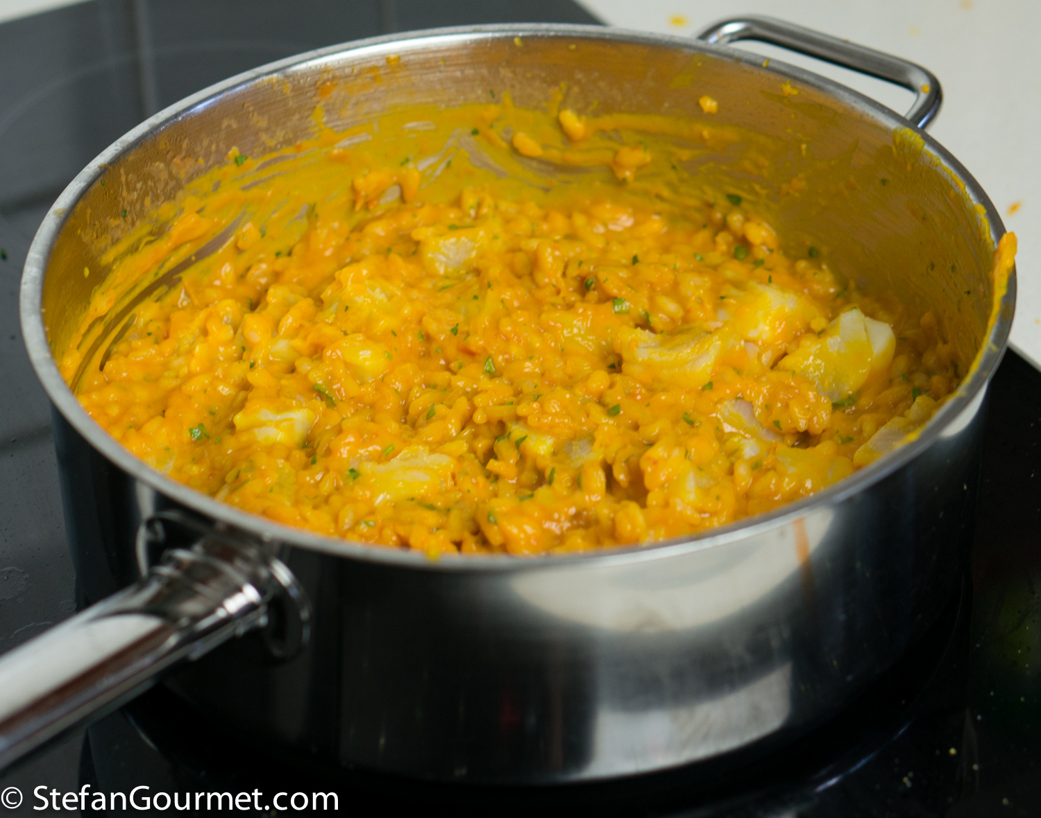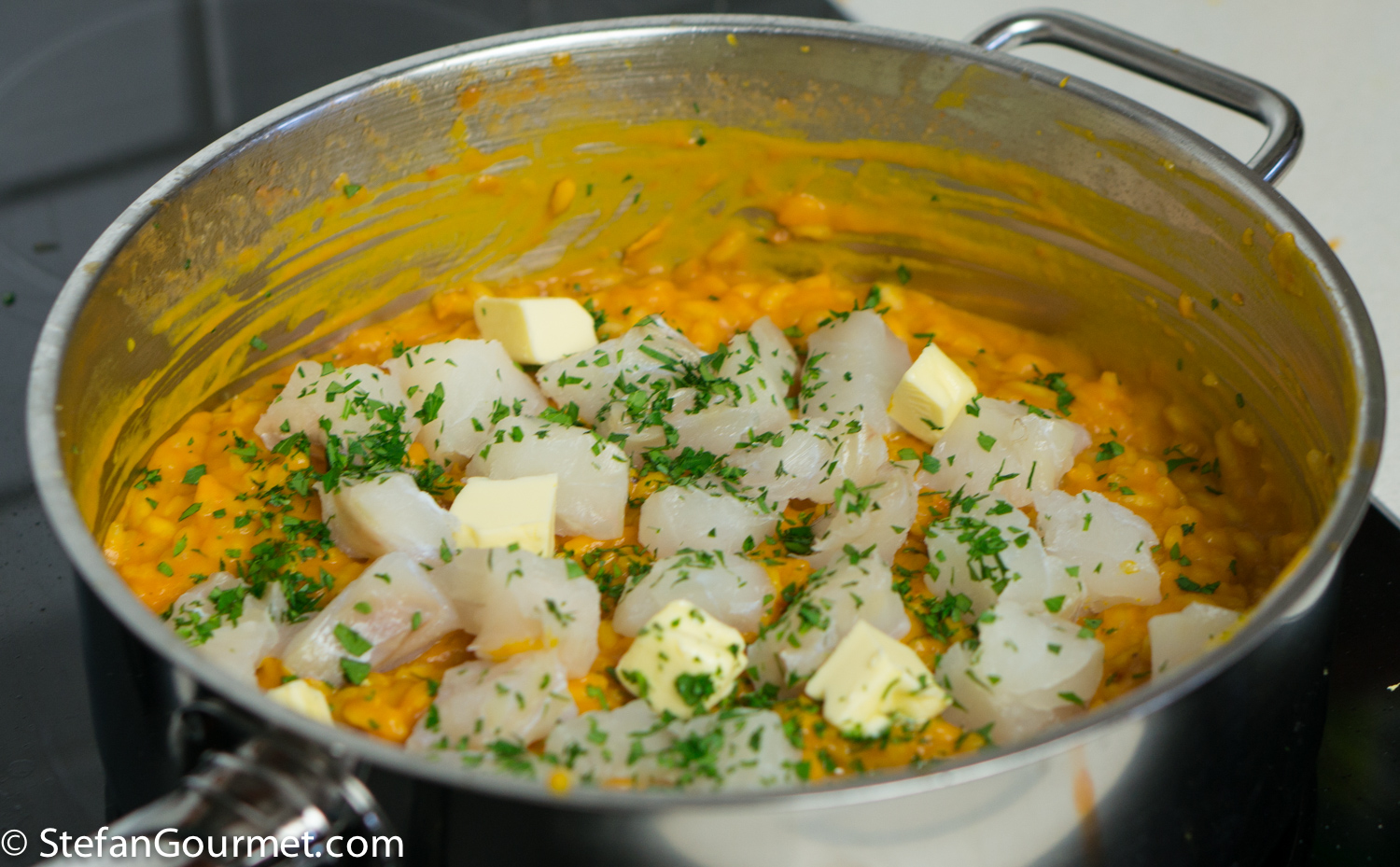This is a ‘Stefan original’ I’ll certainly try tho’ it will have to be with a different fish. Have never thought of adding ‘left-over’ tomatoes [often in the fridge] twixt the wine and stock and the use of pureed carrots is most innovative! What an interesting dish which must taste a little softer on the palate than the ‘usual’ ridotto. [Glad you steamed them too!]