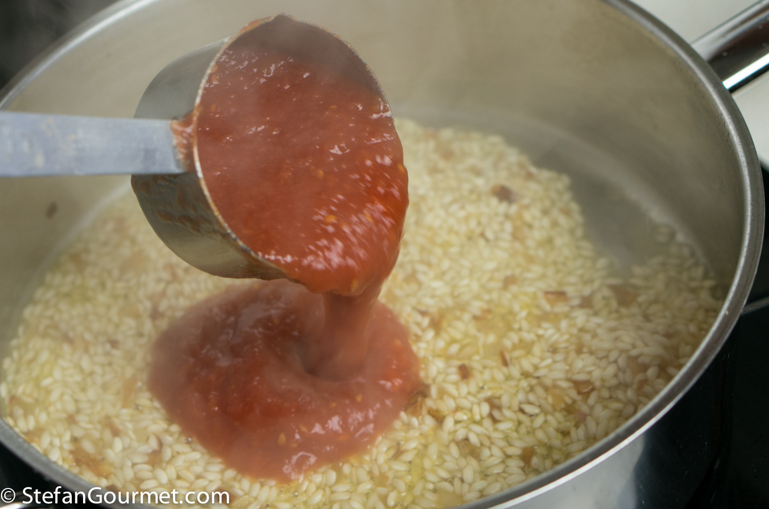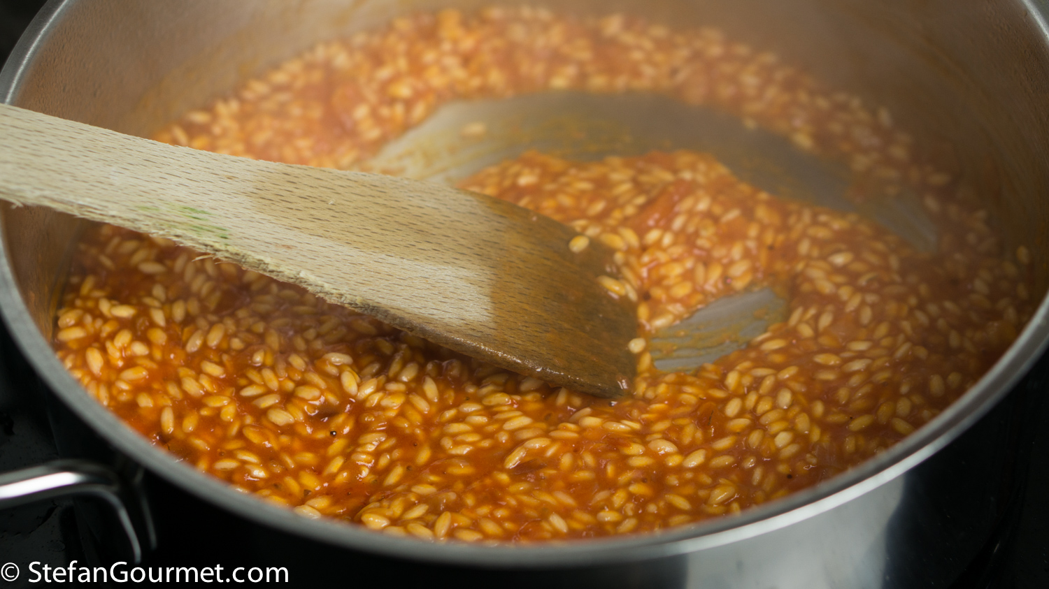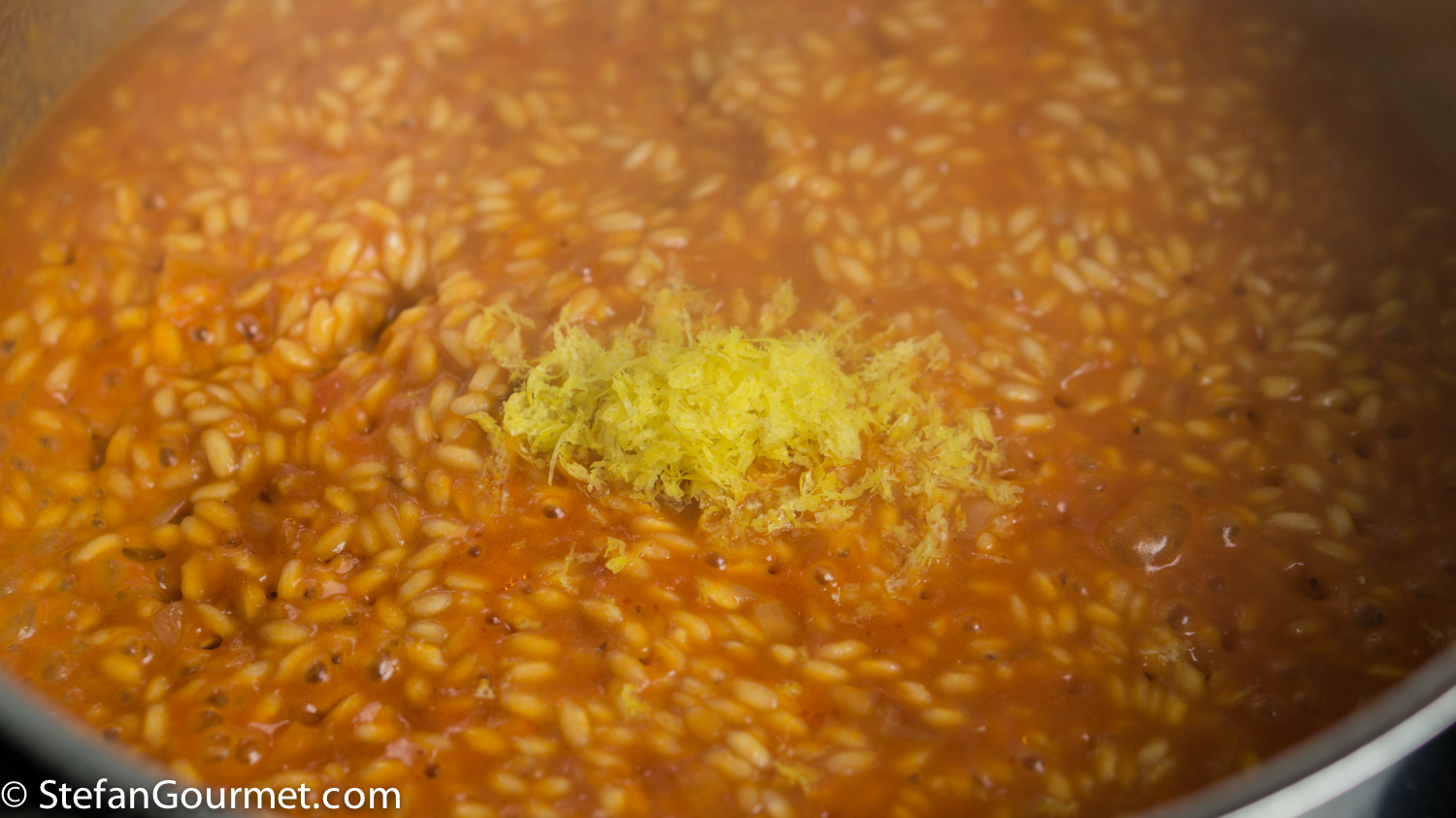 This is a ‘Stefan original’ I’ll certainly try tho’ it will have to be with a different fish. Have never thought of adding ‘left-over’ tomatoes [often in the fridge] twixt the wine and stock and the use of pureed carrots is most innovative! What an interesting dish which must taste a little softer on the palate than the ‘usual’ ridotto. [Glad you steamed them too!]