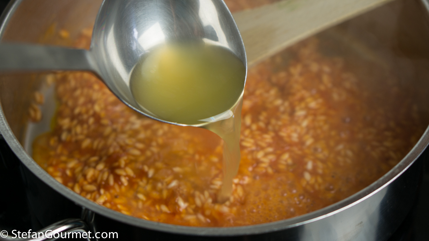 Add a ladle of hot fish stock (be careful when you lift the basket with the carrots so the steam doesn’t burn you) to the rice, and stir over medium heat until the stock has been absorbed.