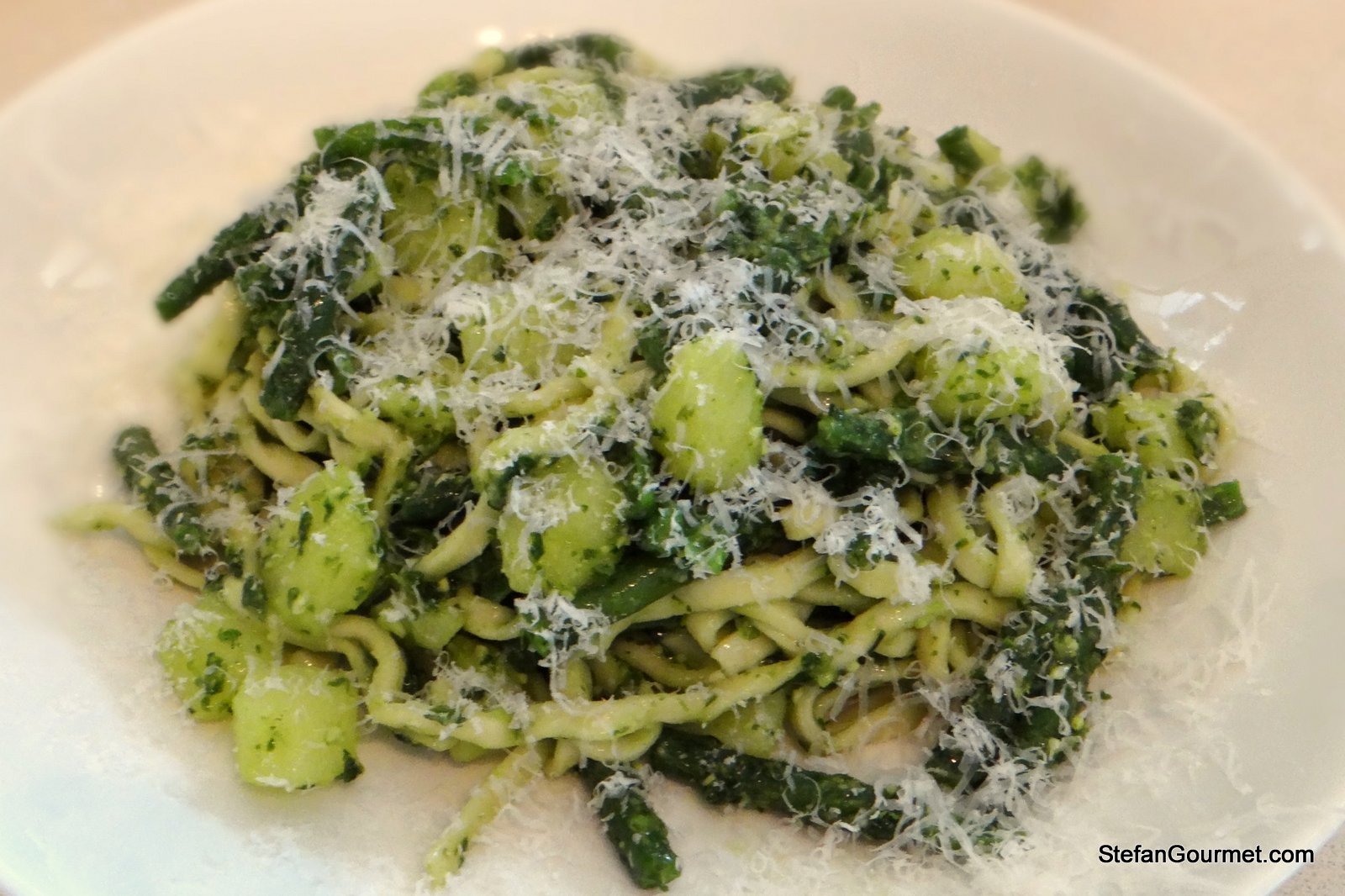 Trenette alla Genovese is fresh pasta cooked with haricots verts and potatoes, and served with pesto alla genovese. A delicious summery pasta dish from Liguria.