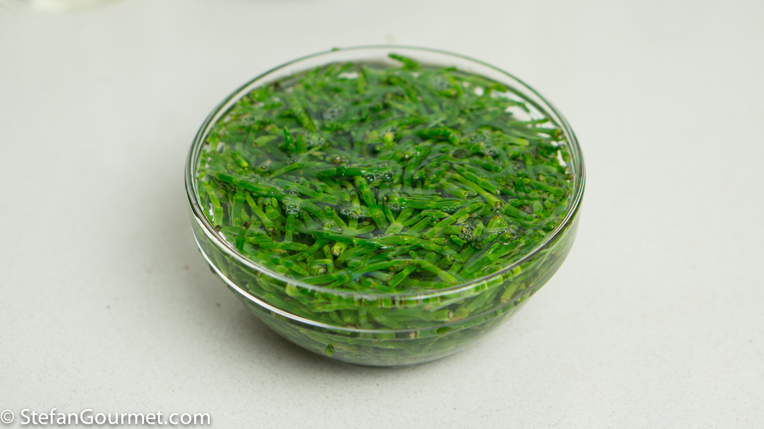 Soak 150 grams (.33 lb) of samphire in cold water (to remove a bit of the saltiness).