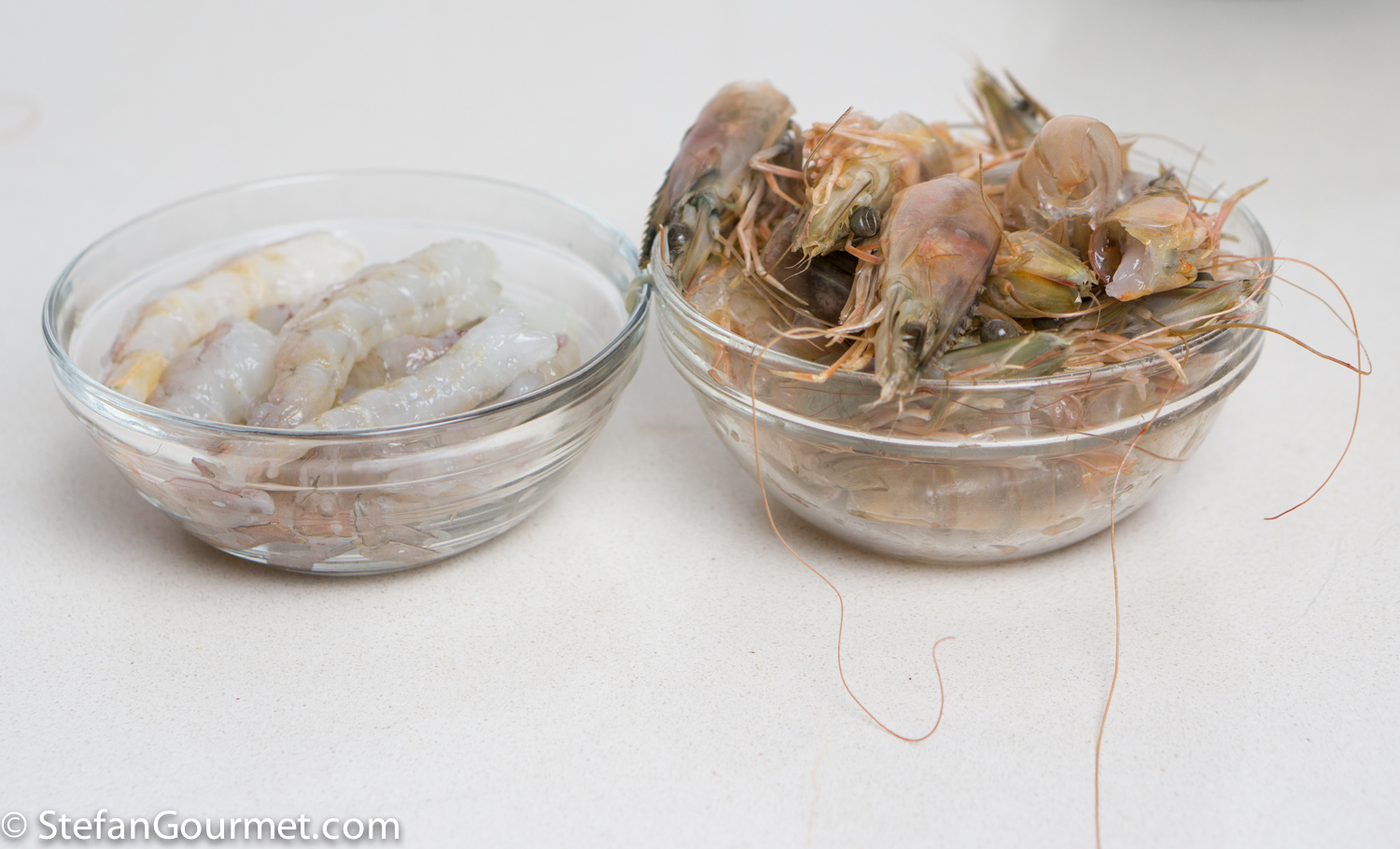 Peel 500 grams (1.1 lb) of jumbo shrimp, reserving the heads and shells.