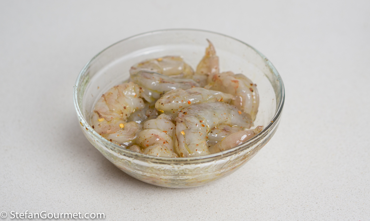 Add a tablespoon of olive oil, 1/2 tsp of chilli flakes, and 1/2 tsp of salt to the shrimp. Mix and allow to marinate for about half an hour.