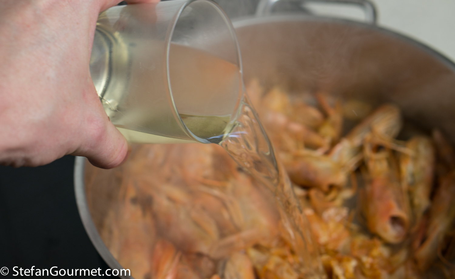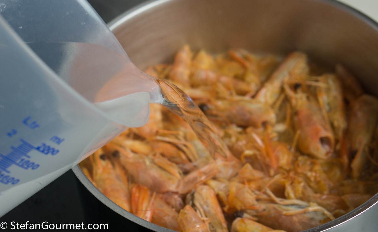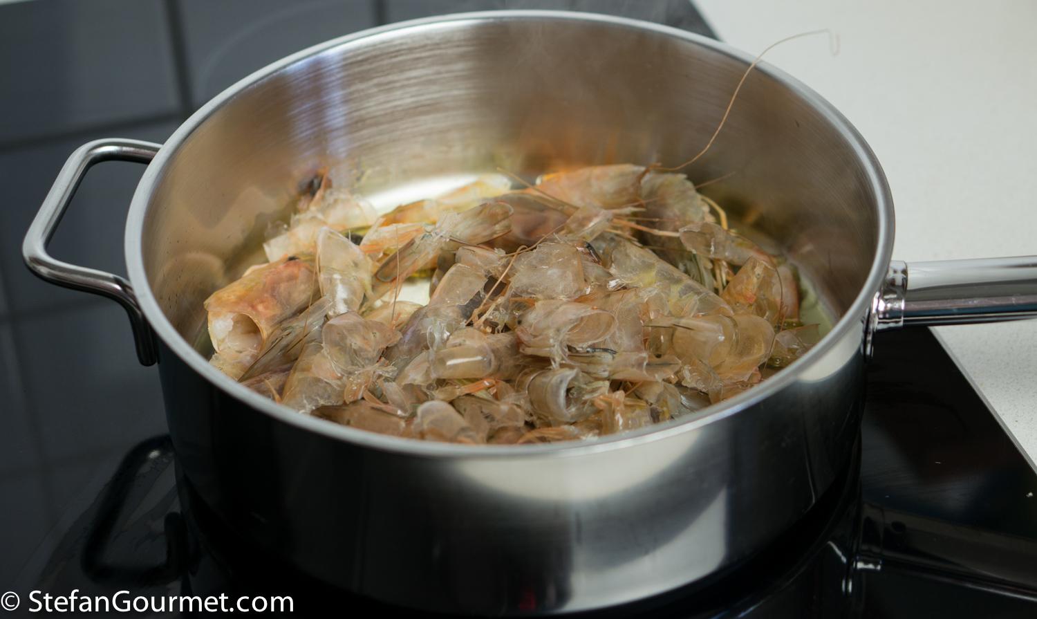 Meanwhile, heat a tablespoon of olive oil in a frying pan and add the reserved shrimp heads and shells. Stir over medium high heat until they are pink all over.