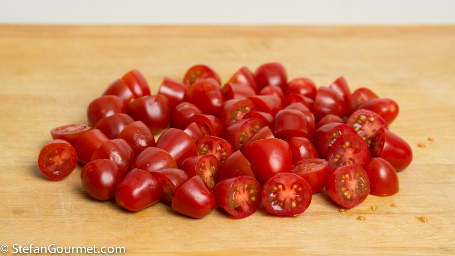 Meanwhile, cut 250 grams (.55 lb) of cherry tomatoes in half.