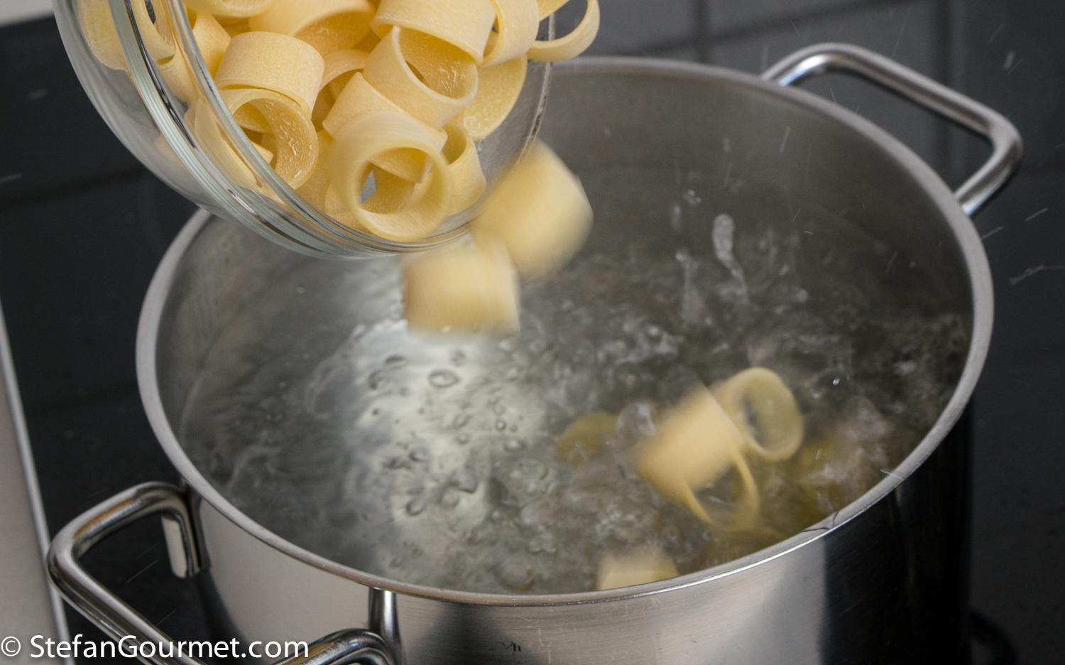 Bring a pot of water to a boil. Add salt and 150 grams (.33 lb) of calamarata, mezze maniche, paccheri, or other short pasta. Set the timer for 2 minutes less than the time indicated on the package for al dente.