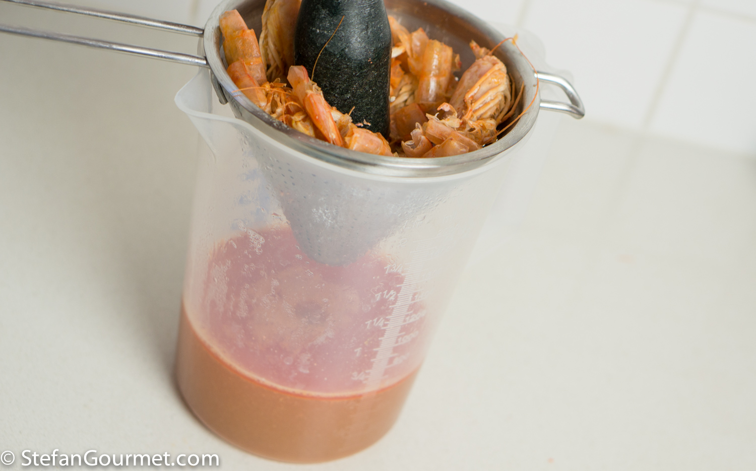 When the shrimp shells have simmered for 20 minutes, strain the shrimp stock and push down on the shrimp heads to squeeze as much flavor out of them as possible. I like to use a chinois and a pestle to do this job.
